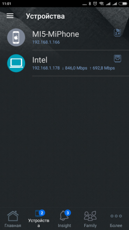 Пункт меню «Устройства» покажет вам текущий список клиентов с типом подключения и IP-адресами. Из него можно перейти в параметры настройки каждого устройства, где можно посмотреть именно его трафик, блокировать доступ к интернету, ограничить скорости приема и передачи, а также переименовать клиента. Отметим, что все операции осуществляются «на лету» без перезагрузки роутера.