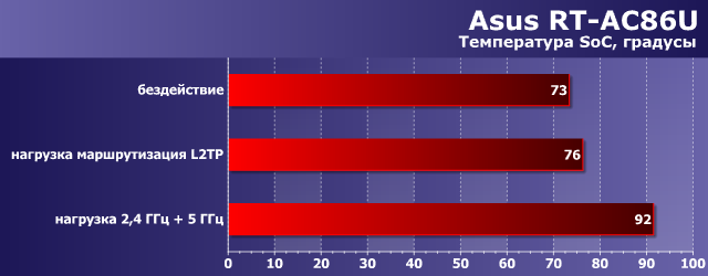 К сожалению, текущая версия программного обеспечения роутера не позволяет оценить температурный режим радиоблоков, так что на следующем графике приводятся только значения для датчика температуры основного процессора. Всего было проверено три сценария — бездействие, маршрутизация с L2TP и одновременная трансляция на двух беспроводных клиентов в диапазонах 2,4 и 5 ГГц.