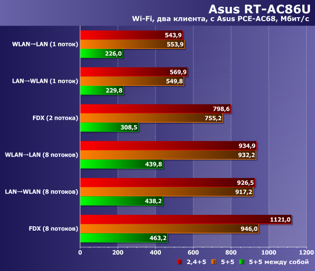Роутер имеет два радиоблока, обеспечивающие подключение на скоростях до 750 и 2167 Мбит/с в диапазонах 2,4 и 5 ГГц соответственно. Однако надо понимать, что эти цифры в основном носят маркетинговый характер — найти клиентов, которые способны работать с этими скоростями очень непросто (если не считать варианта второго такого же роутера в режиме клиента). Так что наше тестирование, в котором использовались адаптеры Asus PCE-AC68 с тремя антенными и максимальной скоростью подключения «всего» 1300 Мбит/с, все-таки можно считать показательным. В этом тесте расстояние между роутером и клиентом составляло около четырех метров по прямой видимости.