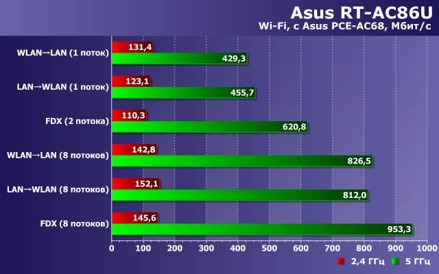 Однако покупать роутер подобного уровня без цели работать с 802.11ac в диапазоне 5 ГГц как минимум странно. Тестирование даже с нашим «не максимальным» адаптером показало, что в однопоточном режиме можно получить более 400 Мбит/с реальной скорости, а при работе в несколько потоков производительность превышает 800 Мбит/с.