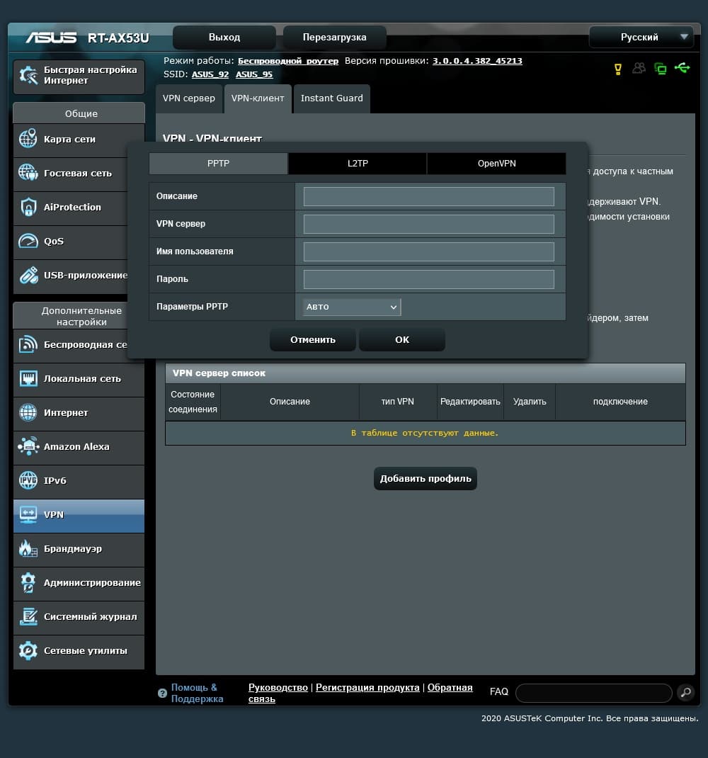 Кроме того, роутер может выступать и в роли клиента VPN с подключением к удаленному серверу, что позволяет «вывести» через него в интернет все устройства локальной сети. В данном сценарии поддерживаются протоколы PPTP, L2TP и OpenVPN. Заметим, что при активном подключении через него работают сразу все клиенты. Выбрать только часть из них нельзя.