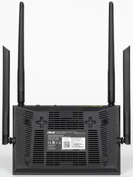 На фоне топовых моделей, рассматриваемый роутер можно назвать компактным — габаритные размеры без учета антенн и подключения кабелей составляют 190×125×48 мм. Антенны несъемные, установлены сзади и на боковых сторонах. Длина подвижной части составляет 175 мм. С учетом этого, в случае вертикального расположения антенн роутеру потребуется около 230×150×190 мм пространства для установки.