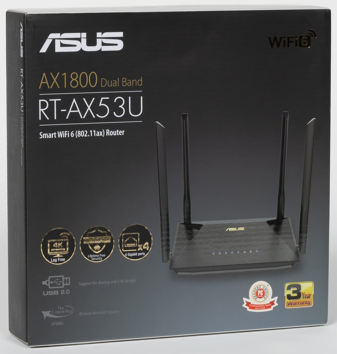 В этот раз мы решили познакомиться с устройством начального уровня — роутером Asus RT-AX53U. Эта модель оборудована гигабитными сетевым портами, имеет беспроводной модуль класса AX1800 и порт USB 2.0. С точки зрения возможностей встроенного программного обеспечения AsusWRT здесь есть практически всё, что мы привыкли видеть в прошивках этого производителя, включая набор сервисов AiProtection, гостевые сети Wi-Fi, приложения для USB-накопителей, сервер VPN и так далее. По сути, единственным заметным отличием от старших моделей можно назвать только отсутствие поддержки AiMesh.