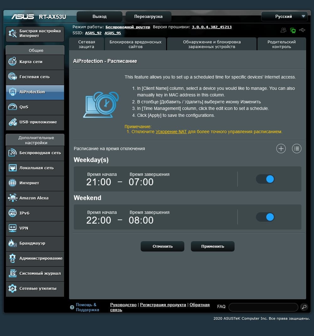 Функция «Родительский контроль» в этом же разделе позволяет настроить расписание блокировки доступа к интернету для выбранных устройств. Отметим, что в данной модели отсутствует сервис установки фильтра контента по категориям.