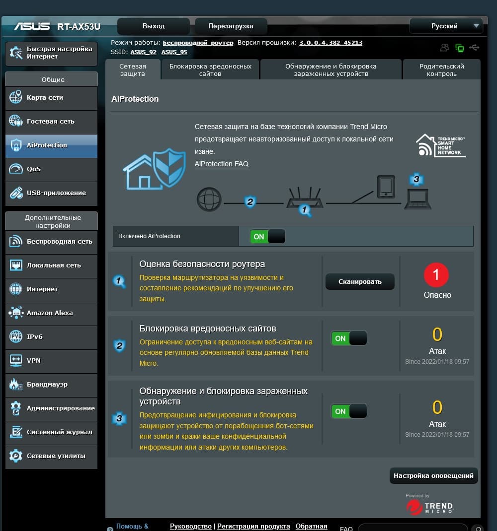 Сервис AiProtection работает с использованием технологий компании Trend Micro. Он позволяет проверять настройки роутера с точки зрения безопасности (сложные пароли, отсутствие внешнего доступ и так далее), блокировать доступ к вредоносным (по мнению базы Trend Micro) ресурсам, обнаруживать и блокировать зараженные устройства в локальной сети.