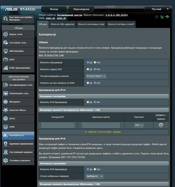 В разделе «Брандмауэр» также все привычно для прошивок роутеров Asus. Встроенный межсетевой экран имеет функцию защиты от DDoS-атак и настраиваемые фильтры сетевых сервисов (до 32 записей). Дополнительно можно установить правила блокировки сайтов по ключевым словам в URL и содержании страниц. Напомним, что сегодня с распространением https полезность данных функций существенно ограничена.