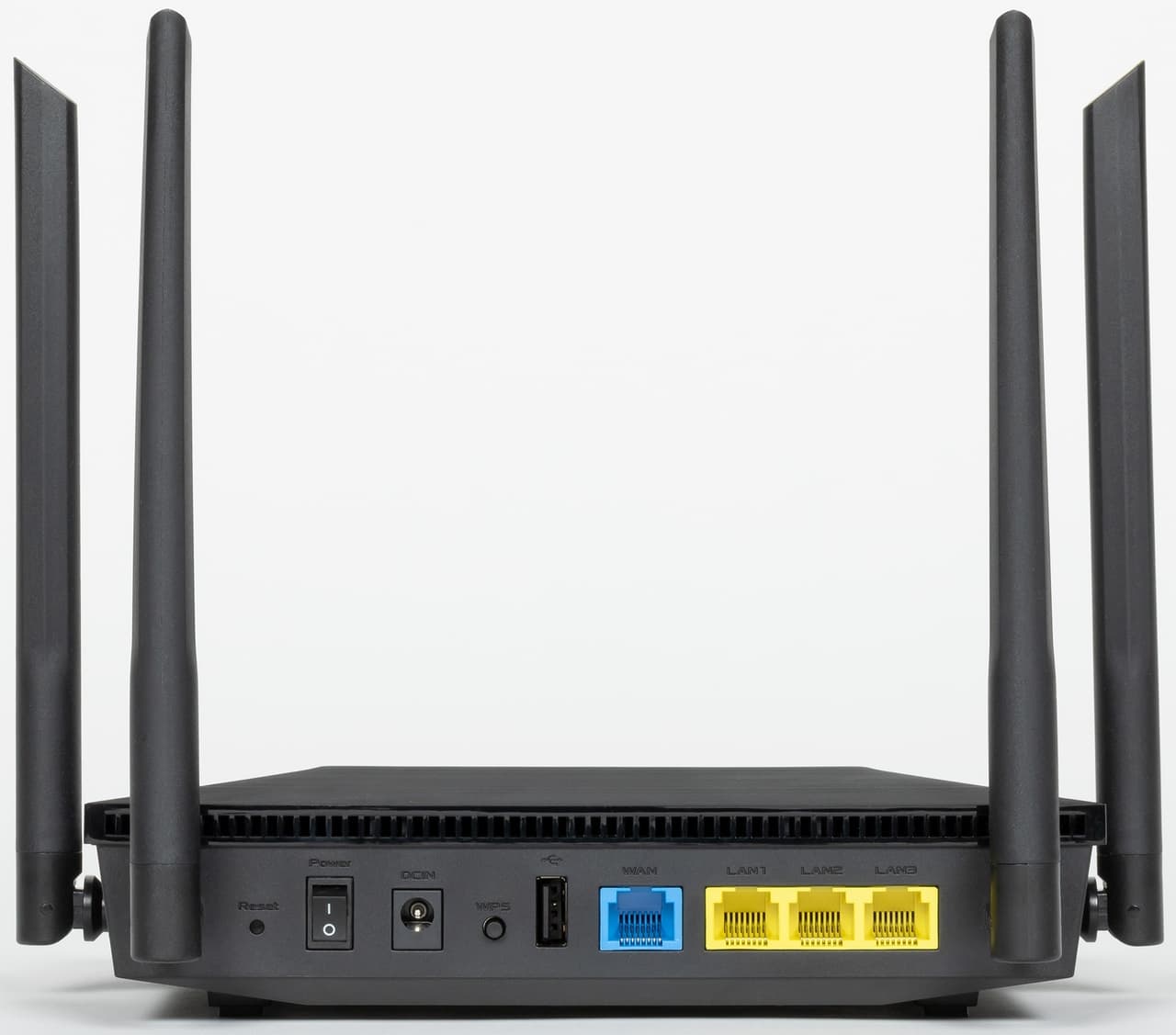 Сзади, кроме антенн, находятся скрытая кнопка сброса, выключатель и вход питания, кнопка WPS/управление Wi-Fi/отключение светодиодов (функция выбирается через веб-интерфейс), порт USB, один порт WAN и три порта LAN. Да, в этой модели только три проводных порта для клиентов локальной сети, но не стоит считать это существенным недостатком.