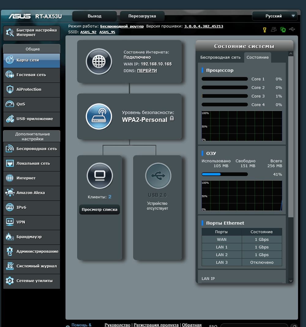На первой странице — «Карта сети» — представлена подробная информация о подключении к интернету, беспроводных сетях, клиентах, USB-устройствах, а также на вкладке «Состояние» — о загрузке процессора, оперативной памяти и состоянии проводных портов.