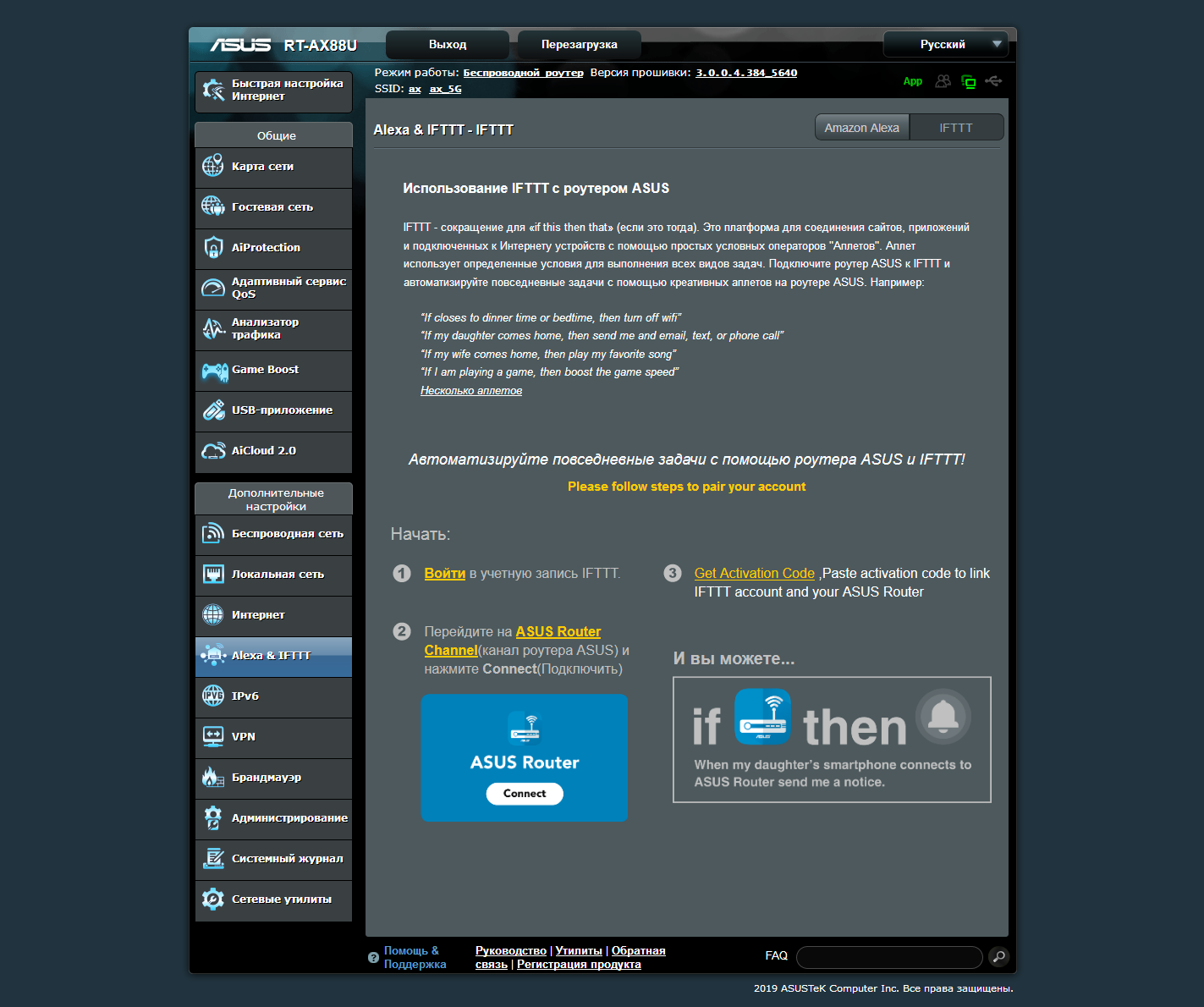 Ну и последняя «модная функция» — интеграция роутера в умные дома. Для экосистемы Amazon Alexa предусмотрено около десяти команд, включая управление гостевой беспроводной сетью, выбор профиля контроля трафика, перезагрузку и некоторые другие. Для IFTTT выбор триггеров и действий тоже интересный. В частности есть событие появления клиента в беспроводной сети и управление Wi-Fi.