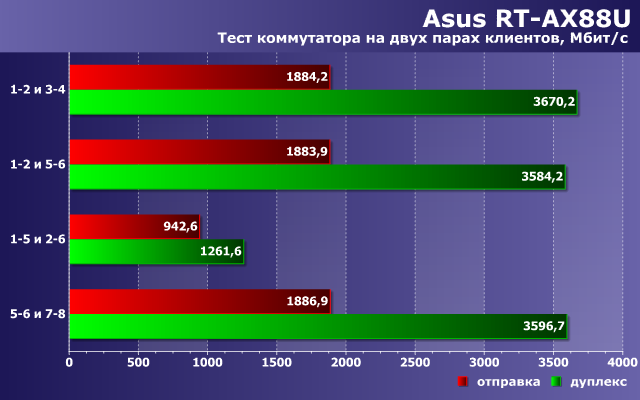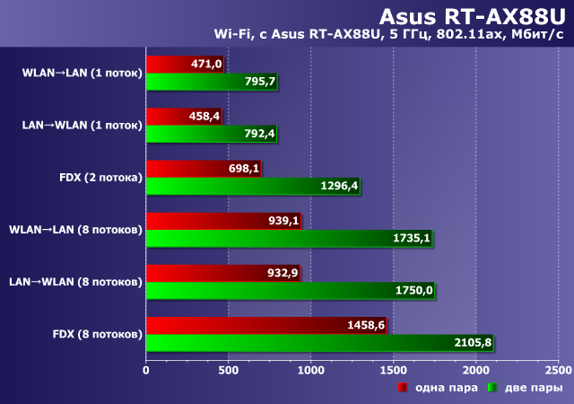 Третий тест проводился совместно со вторым роутером Asus RT-AX88U, работающим в режиме моста. Понятно, что реальная конфигурация в этой паре — работа именно с 802.11ax в диапазоне 5 ГГц. Формальная скорость подключения здесь составляет 3600 Мбит/с. Учитывая такие значения, мы протестировали не только вариант с одной парой клиентов, но и с двумя парами. Устройства во время теста размещались в пределах одной комнаты на расстоянии около четырех метров.