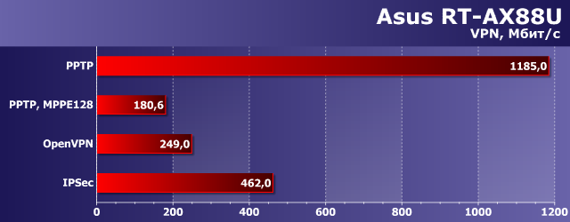 Режим PPTP без шифрования мало кому подойдет, но полезен для сравнения роста требований при активации шифрования. В частности для PPTP с MPPE128 рассматриваемая модель может обеспечить около 200 Мбит/с. Более востребованный сегодня протокол OpenVPN интересен своими возможностями и наличием клиентов под большинство операционных систем и платформ. При работе с ним устройство показывает почти 250 Мбит/с, что является очень высоким результатом для этой реализации безопасных соединений. Напомним, что протестированный три года назад Asus RT-AC88U показывал в этом тесте только 50 Мбит/с. Еще более впечатляют результаты теста сервера IPSec — более 450 Мбит/с. Это позволяет говорить о том, что рассматриваемая модель сегодня является самым быстрым устройством для VPN в домашнем сегменте из протестированных в нашей лаборатории. В частности это обусловлено программной поддержкой специальных блоков ускорителей алгоритмов шифрования в процессоре Broadcom BCM49408.