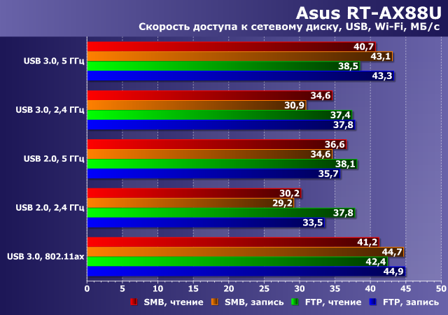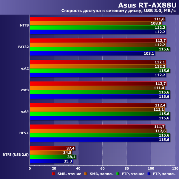 Независимо от протокола, файловой системы и направления передачи данных мы получили здесь более 110 МБ/с, что соответствует гигабитной проводной сети. Можно смело говорить о том, что роутер Asus RT-AX88U способен заменить сетевой накопитель для некоторых задач.