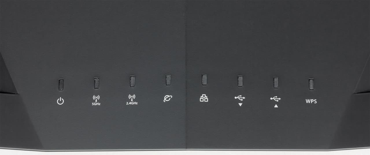 На верхней панели, напоминающей истребители или спортивные автомобили, находится еще одна решетка вентиляции, логотип производителя и блок из восьми светодиодных индикаторов. Большинство из них яркого белого цвета, а индикатор статуса подключения к интернету может также светиться красным в случае проблем.
