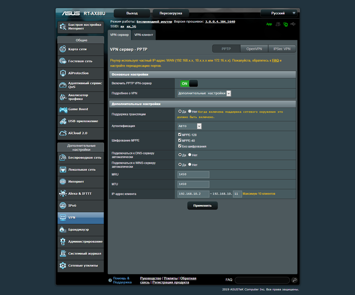 Одним из наиболее востребованных будет сервер VPN, позволяющий реализовать безопасный удаленный доступ к домашней локальной сети. В данном случае речь идет о протоколах PPTP, OpenVPN и IPSec. Этот же программный модуль поможет организовать и дополнительные подключения роутера в роли клиента к внешним серверам по тем же протоколам.