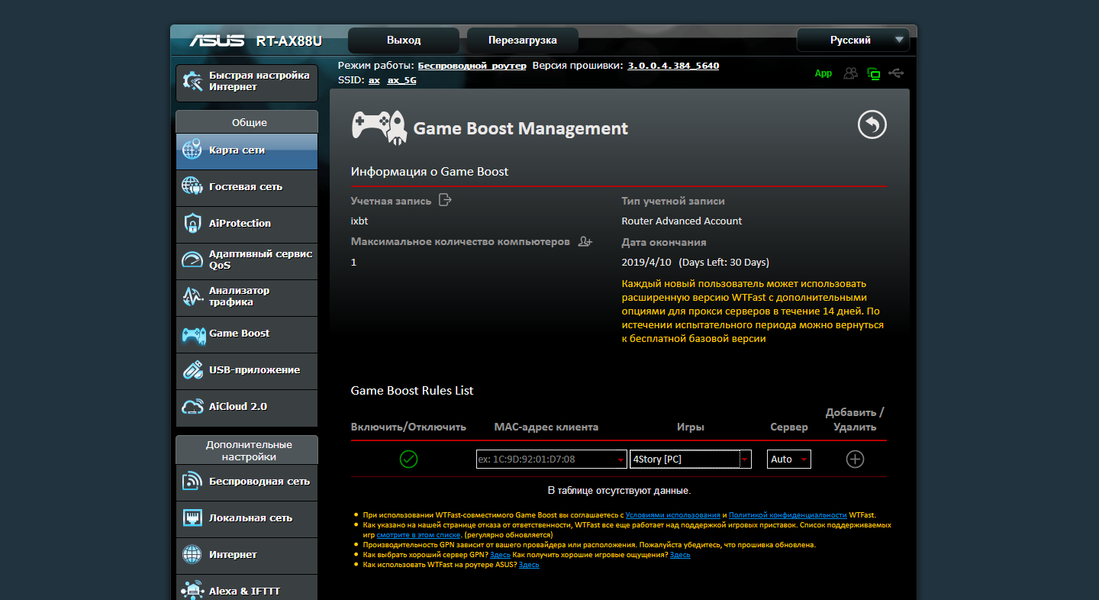 Несмотря на то, что роутер не входит в серию ROG, в его прошивке присутствуют функции Game Boost. В частности компания предлагает подключение к сервису частных виртуальных сетей WTFast с целью более быстрого доступа к игровым серверам. Такая схема представляется несколько необычной, да и входных серверов в нашей стране нет, но возможно в некоторых ситуациях она все-таки может быть полезна.