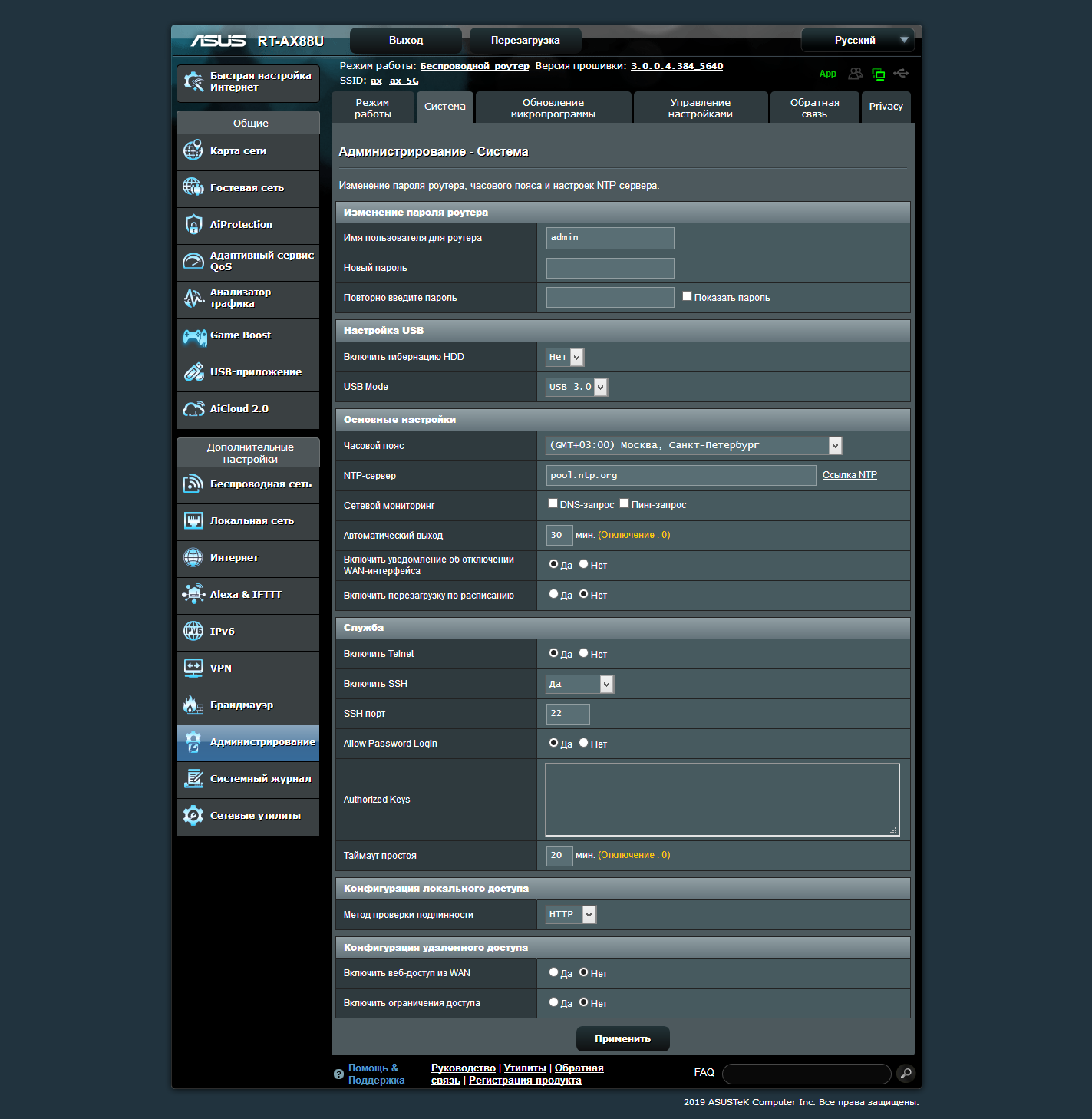 На странице «Администрирование» можно выбрать режим работы устройства — роутер, точка доступа, повторитель, медиамост или узел AiMesh. Кроме того, здесь настраиваются часы, доступ к роутеру по протоколам ssh и telnet, удаленный доступ. Прошивку роутер может обновлять через интернет, но запустить эту операцию должен дать пользователь.