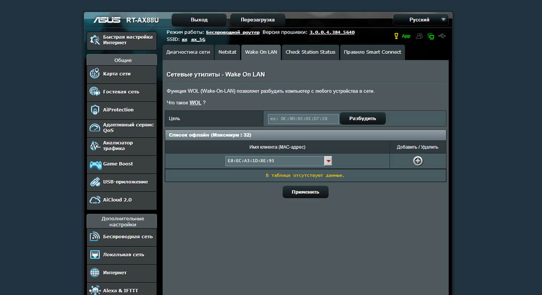 Среди встроенных сервисных утилит отметим наличие кроме привычных ping, traceroute, nslookup и netstat программы для «пробуждения» клиентов по WOL.