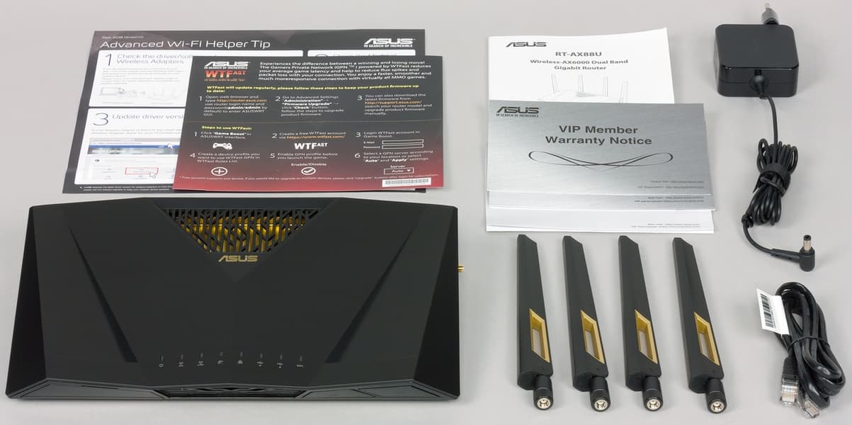 В комплект поставки роутера входят внешний блок питания (19 В 2,37 А 45 Вт), один сетевой патч-корд, четыре съемные антенны, инструкция на нескольких языках, листовка по быстрой настройке. Все это, вместе с роутером, аккуратно разместили в коробке в специальных дополнительных вставках из картона.