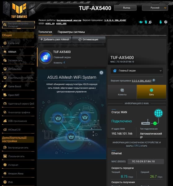 Возможности встроенного программного обеспечения обычные для данного производителя. Отметим такие функции, как организация Mesh-сети, сервисы защиты AiProtection, QoS и анализ трафика, фильтры DNS, VPN Fusion.