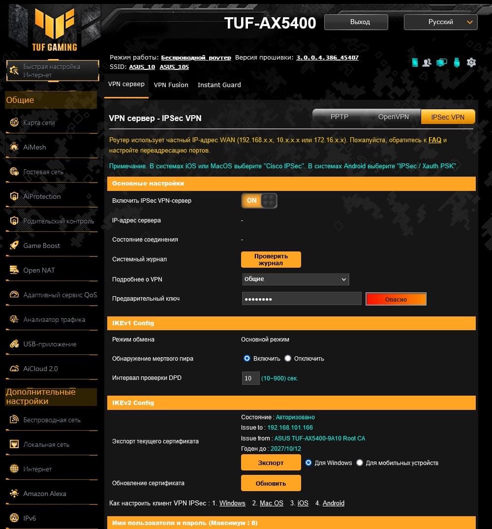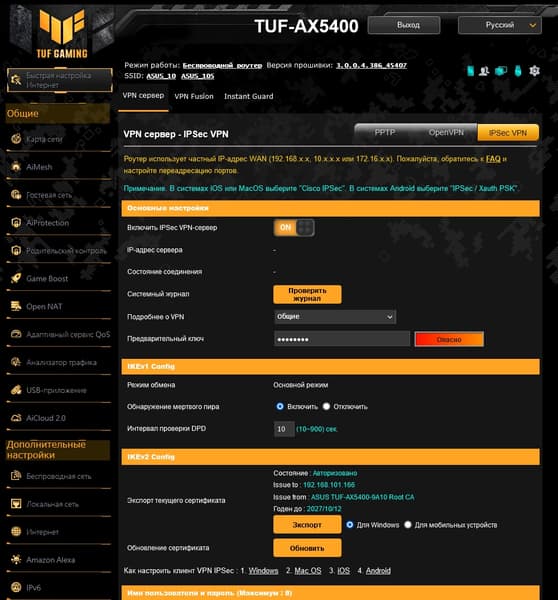 В роутере предусмотрено использование серверов VPN для реализации сценария безопасного удаленного доступа к локальной сети. Для работы сервисов требуется «белый» адрес от провайдера. Поддерживаются протоколы PPTP, OpenVPN и IPSec IKEv2. В последнем случае можно использовать штатные клиенты на платформах Windows, macOS, Android и iOS.
