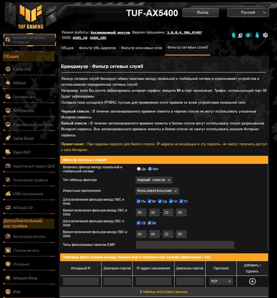 В разделе «Брандмауэр» представлены как традиционный фильтр сетевых служб, так и два сервиса, работающих на уровне URL-адресов. Фильтр предусматривает создание до 128 правил в «черном» или «белом» режиме. При этом правила работают в направлении от локальной сети в интернет. То есть можно заблокировать (или разрешить) какие-то внешние службы по номерам портов, учесть адреса отправителя и сервера, а также протокол. Фильтры URL практически бесполезны, поскольку работают только с HTTP, а большинство сайтов сегодня использует HTTPS.