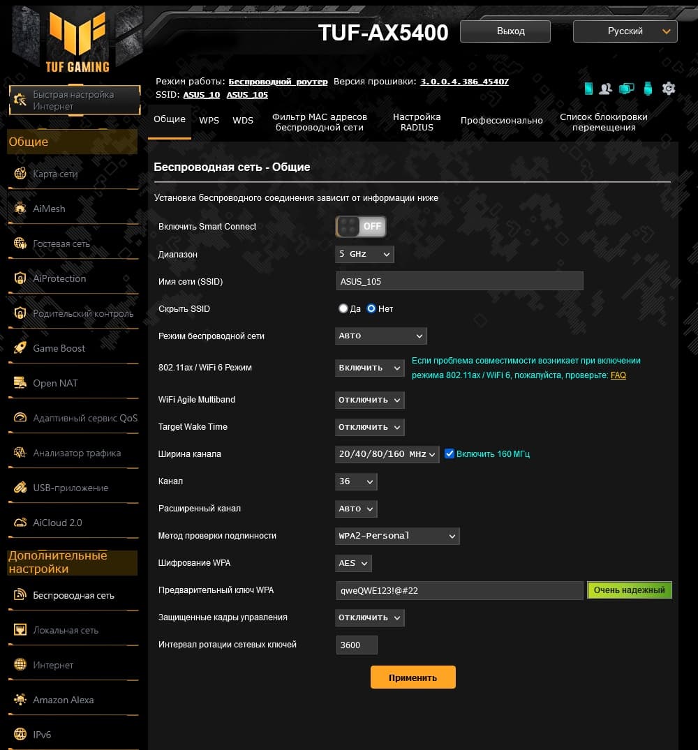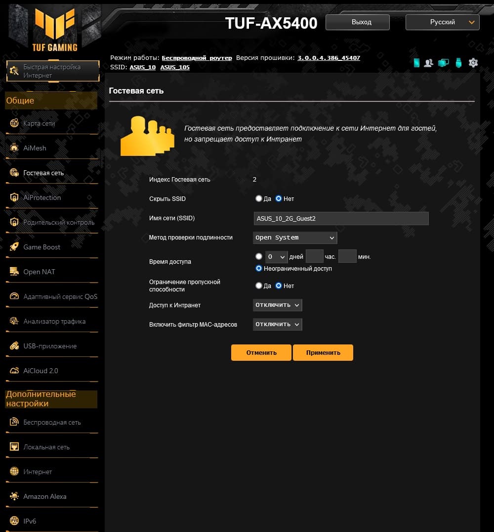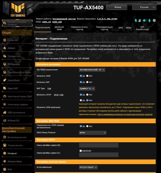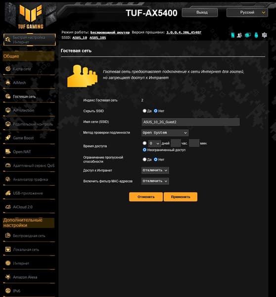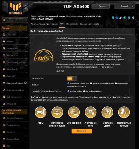 Как и у большинства производителей, возможности прошивки роутеров Asus верхнего сегмента мало отличаются друг от друга, как и дизайн веб-интерфейса. В любом случае, если вы уже работали ранее с таким оборудованием — обновиться будет несложно. У рассматриваемой модели обращает на себя внимание желто-черная гамма и логотип TUF GAMING в левом верхнем углу. Интерфейс имеет переводы на несколько языков, включая русский. Предусмотрен мастер быстрой настройки, в котором можно указать основные параметры работы устройства.