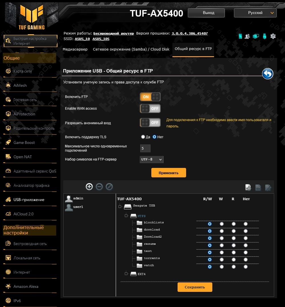 Что касается файлов, то роутер поддерживает подключение USB-накопителей для работы с документами по протоколам SMB и FTP. Первый востребован для локального доступа, а второй может использоваться и через интернет.