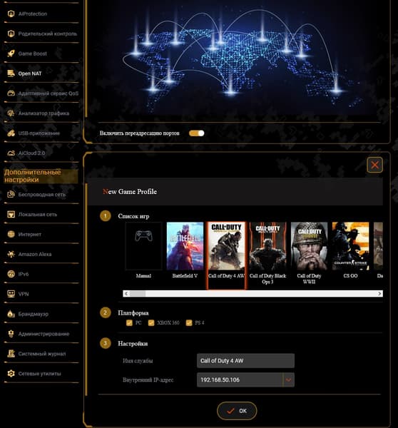 Game Boost является скорее ярким названием для перехода к двум следующим страницам, чем отдельной функцией. В частности, OpenNAT позволяет настроить проброс портов с использованием заранее подготовленных производителем профилей. Достаточно только указать клиента и выбрать приложение.