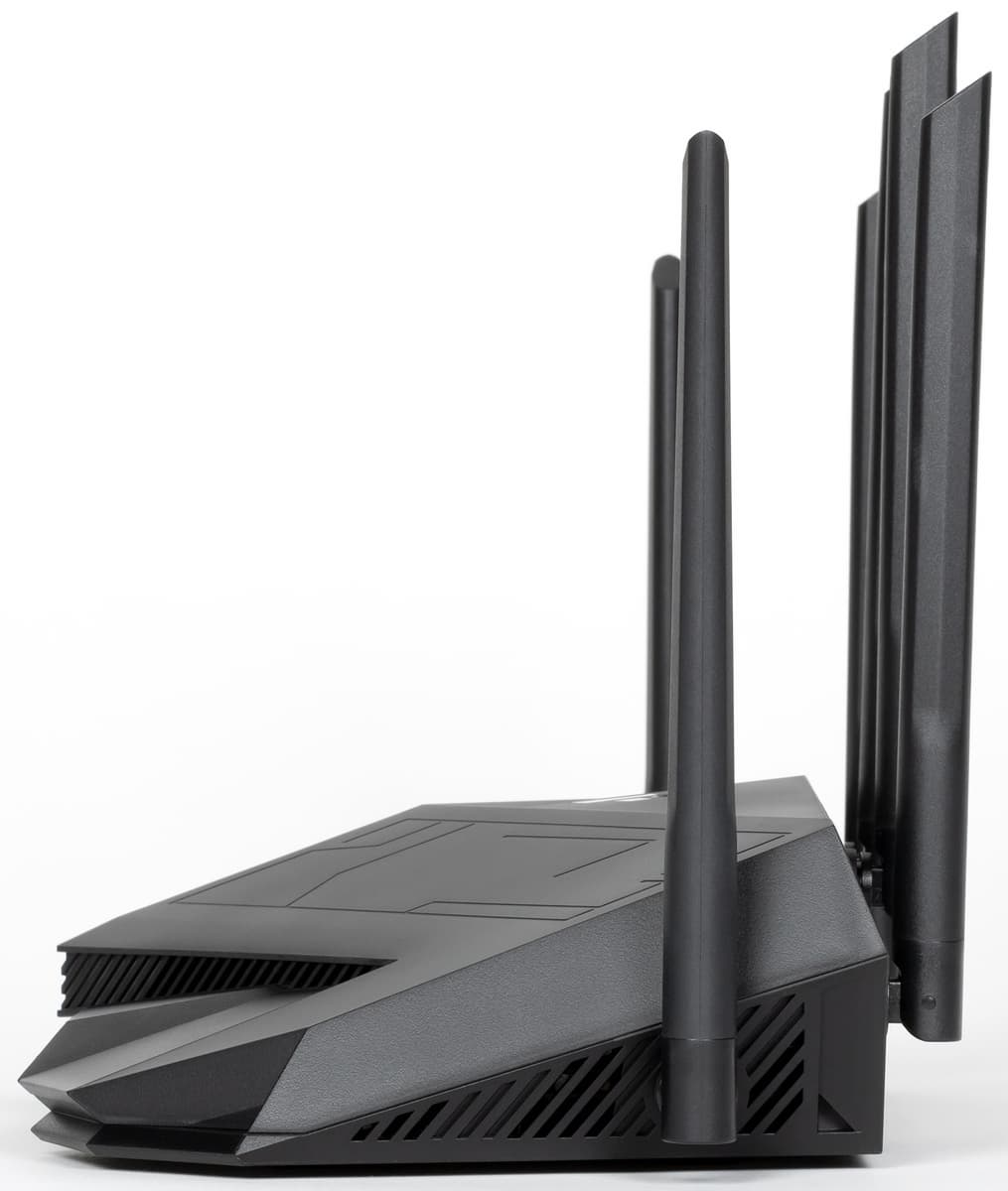 Корпус роутера выполнен из крепкого черного матового пластика. Габаритные размеры без учета антенн составляют примерно 260×160×70 мм. Антенны, представленные в количестве шести штук, несъемные и имеют по две степени свободы. Длина подвижной части — 175 мм. Итого, если ориентировать все антенны вверх, то для установки потребуется около 290×180×210 мм.