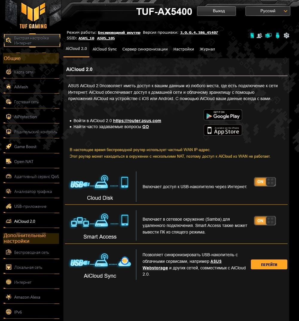 Традиционно в прошивке присутствует фирменный набор сервисов AiCloud 2.0. Напомним, что для работы с ними через интернет необходимо иметь на роутере «белый» адрес. Кроме обеспечения доступа из фирменного мобильного приложения к файлам на внешнем USB-накопителе, здесь есть функция синхронизации выбранной папки на диске с внешним ресурсом (поддерживаются собственное облачное хранилище Asus WebStorage, DropBox, FTP и SMB). Есть также возможность организовать обмен данными между разными пользователями AiCloud 2.0.