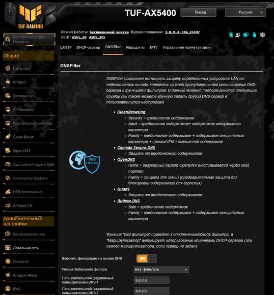 Для локального сегмента сети можно установить имя и собственный адрес роутера, настроить сервер DHCP, включая выделение фиксированных адресов клиентам, добавить пользовательские маршруты, настроить работу IPTV приставки (выделенный порт, VLAN, udpxy). Дополнительно в прошивке реализована технология фильтрации запросов DNS с использованием нескольких сервисов, причем каждому клиенту локальной сети можно назначить собственный профиль, а также выбрать профиль для всех остальных устройств.