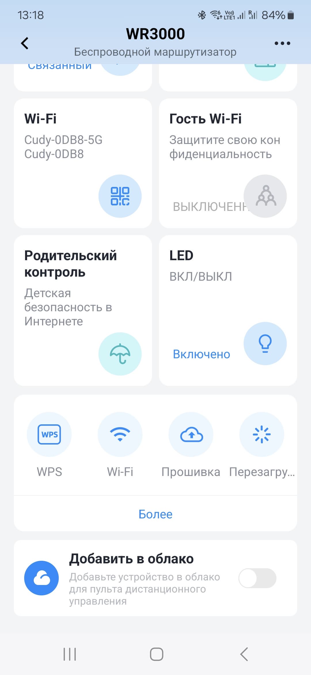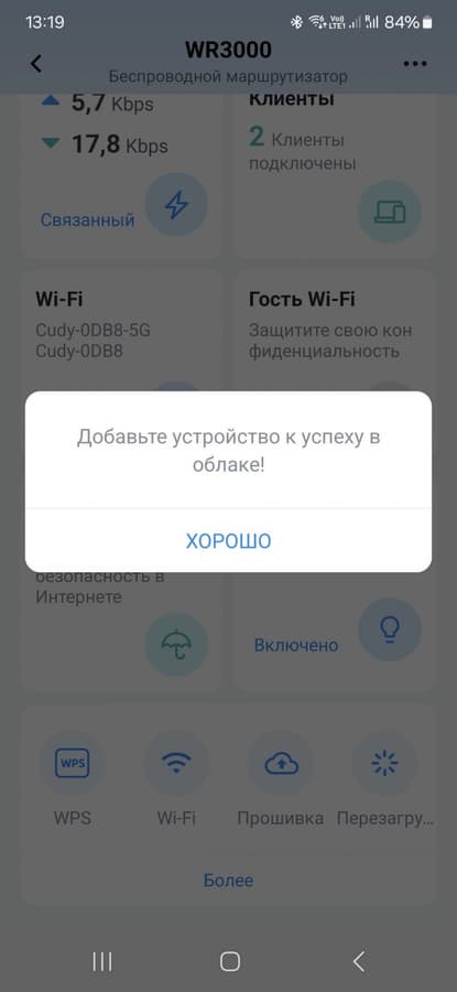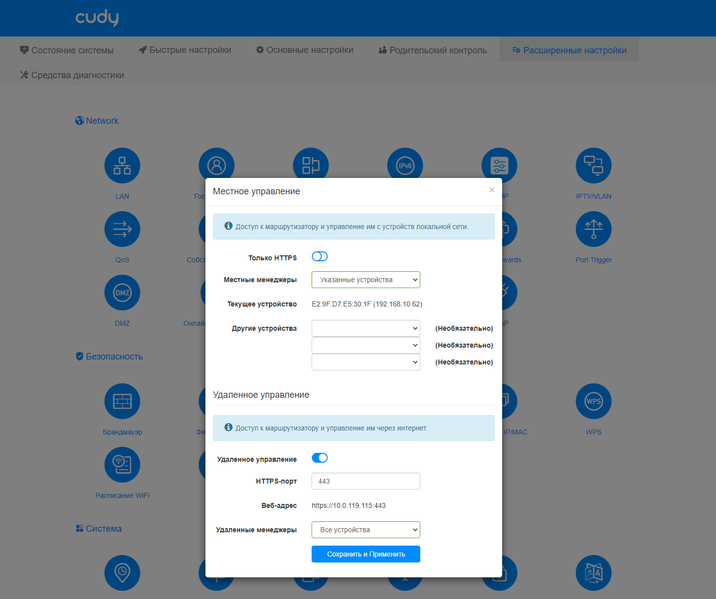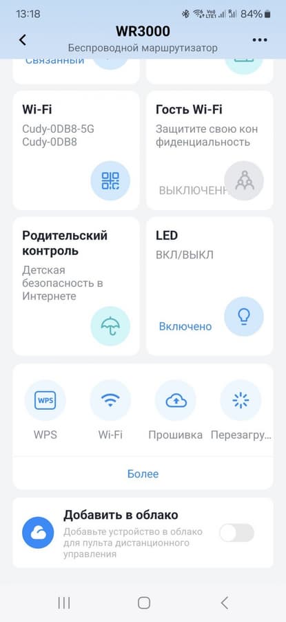 На странице с описанием роутера на сайте производителя обнаружилась функция облачного доступа и управления. Странно, что в веб-интерфейсе про это ничего не было. Для работы с данным сервисом нужно установить фирменное приложение Cudy на смартфон (поддерживаются Android и iOS) и зарегистрировать через него аккаунт. Далее можно подключиться к сети роутера и получить доступ к нему (конечно, потребуется знать пароль администратора роутера). После этого в программе можно активировать облачный режим и тогда работать с роутером можно будет из любой точки мира (при условии, что на роутере есть интернет).