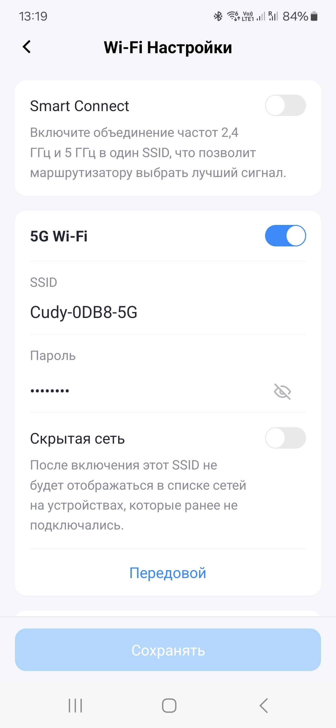 Основные настройки беспроводных сетей обычны — имя, защита и пароль. Есть возможность использования технологии «Смарт Коннект», когда создается только одна сеть, а клиенты выбирают лучший для них вариант. В расширенных настройках точек доступа есть также такие параметры, как режим, номер канала, ширина канала, мощность передатчика и другие. Для 5 ГГц поддерживаются каналы 36—64 и 100—140.