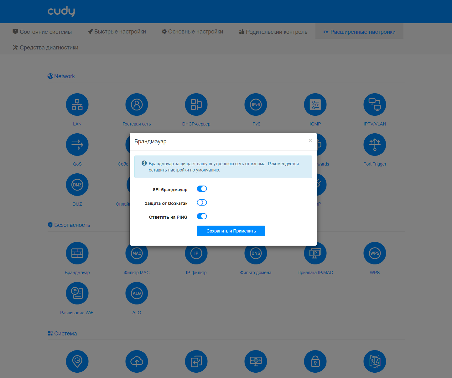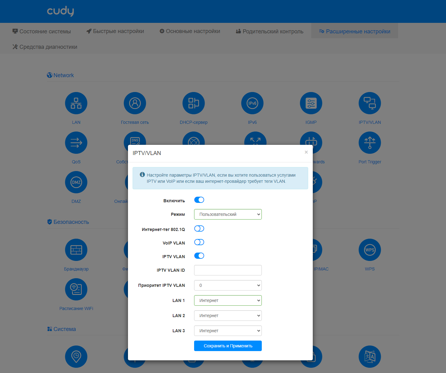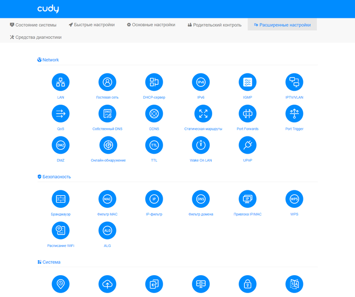 Далее идет очень большой раздел «Расширенные настройки». В нем насчитывается более 35 страниц, сгруппированных по темам. Все описывать здесь не будем, посмотрим только на самые полезные. Для интересующихся подробностями напомним ссылку на эмулятор веб-интерфейса.