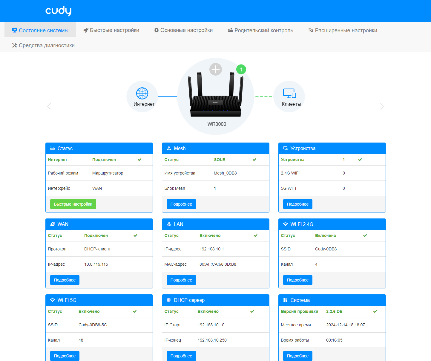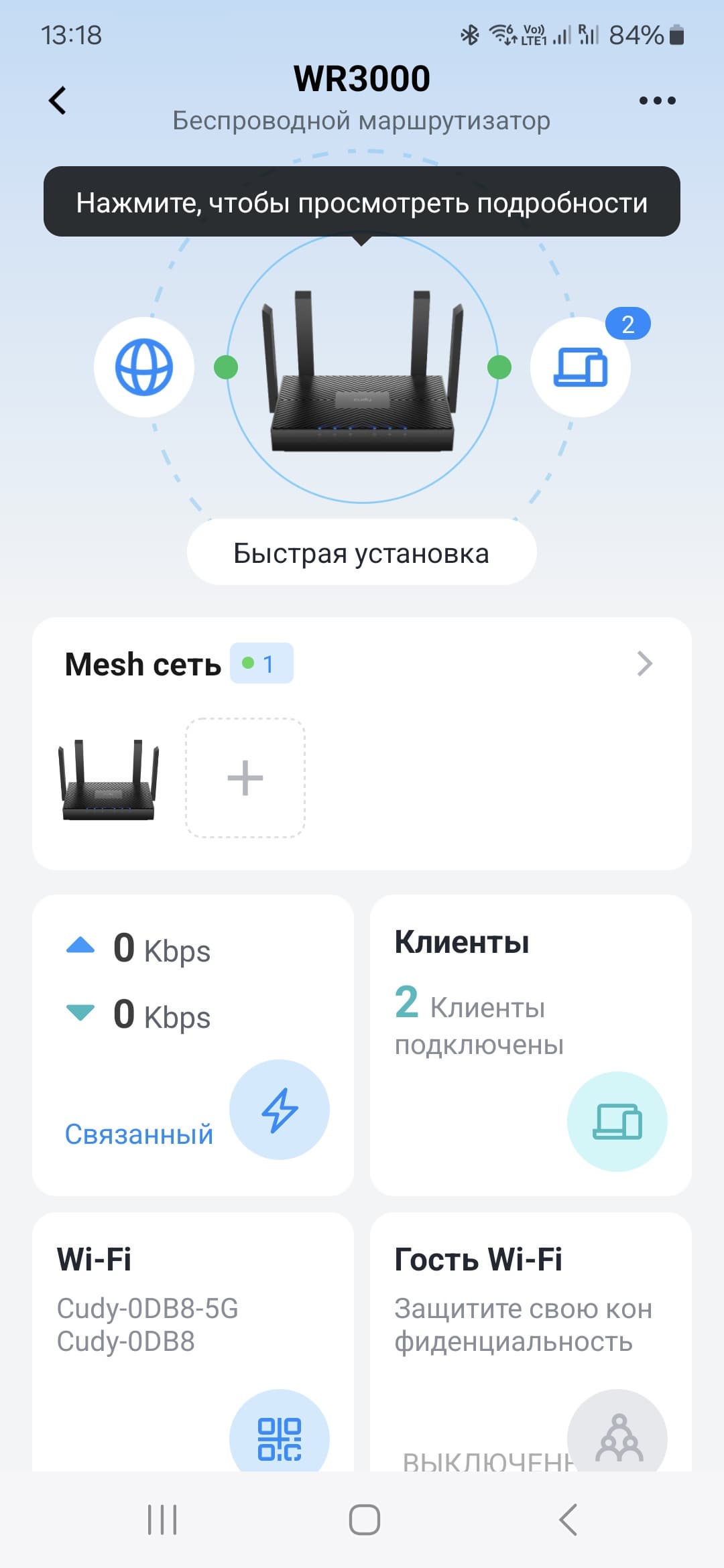 Обратите внимание на зеленый круг около изображения роутера — это переход к настройке Mesh-сети. Хотя можно воспользоваться и кнопкой «Подробнее» на одноименной плитке. У нас на тесте было только одно устройство, так что эту функциональность мы не проверили. Но технология в целом уже не новая, так что всё должно работать согласно заявленным возможностям — расширение зоны покрытия сети по кабелю или без него с автоматическим переключением клиентов на обеспечивающую лучше качество связи точку доступа. При этом на основном устройстве через соответствующее меню можно осуществлять некоторые сервисные операции с другими узлами.