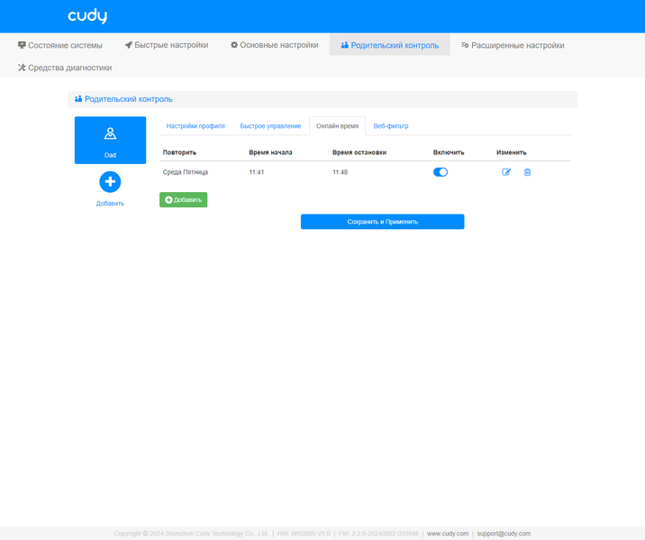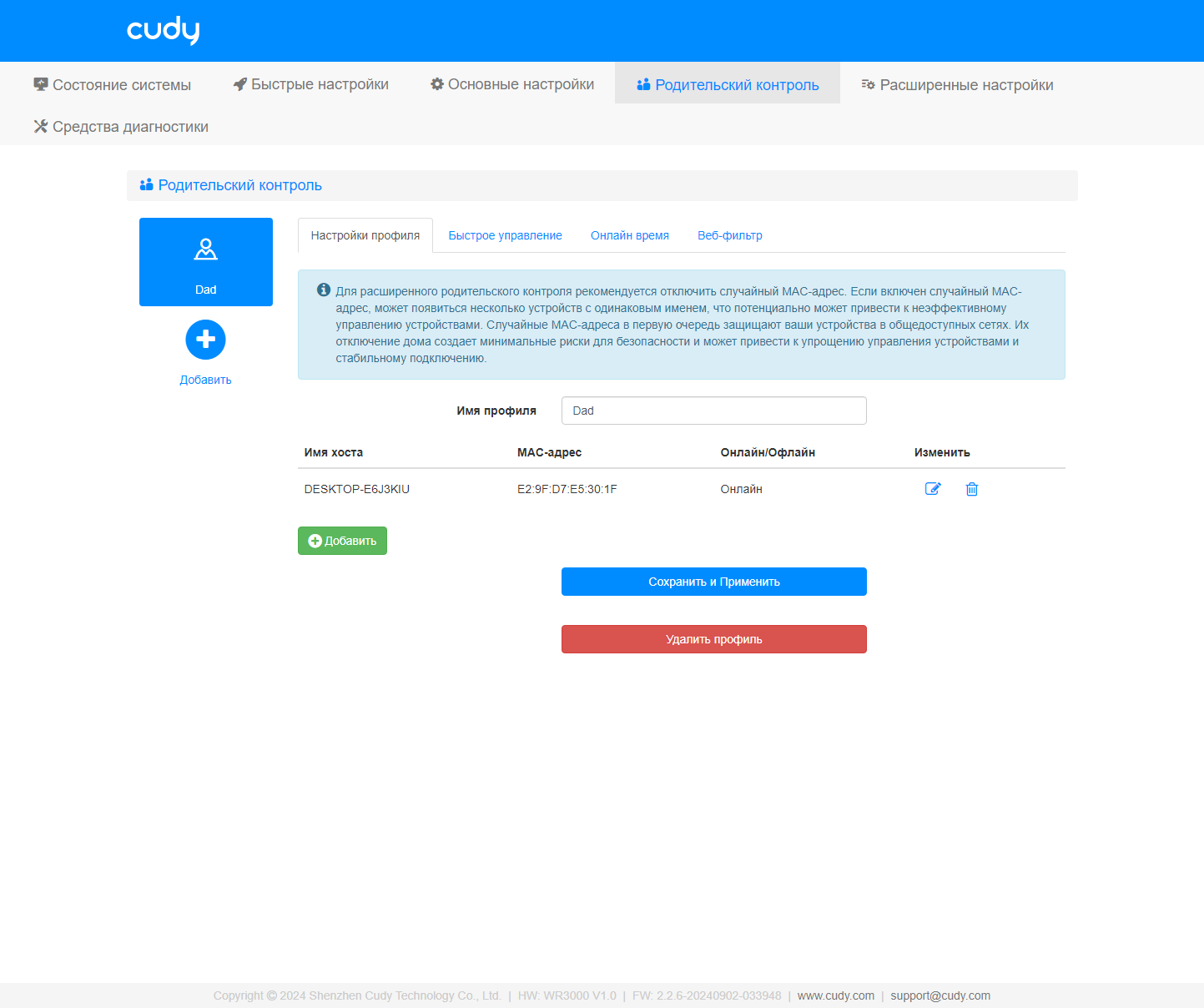 В отдельный пункт верхнего уровня меню вынесли «Родительский контроль». В данном случае речь идет о настройке профилей доступа и распределении клиентских устройство по ним.