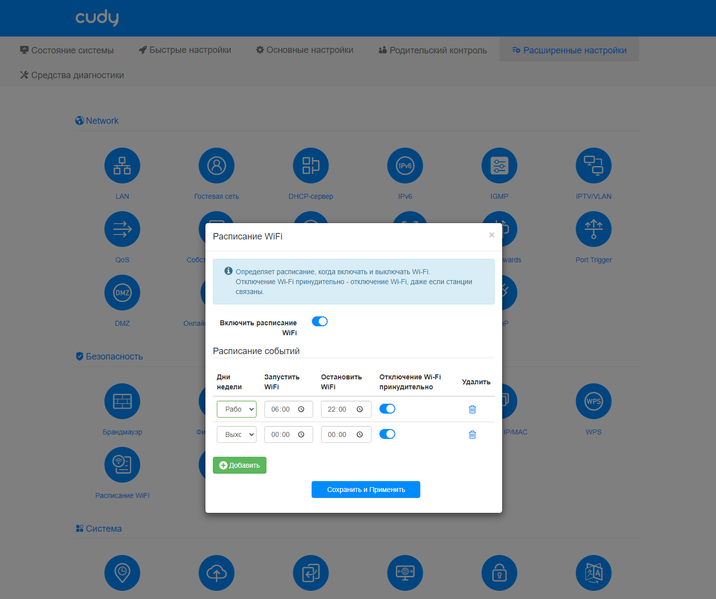 Также сюда добавили настройку расписания работы Wi-Fi. Предусмотрено указание нескольких временных интервалов с точностью до минуты и с учетом дней недели.