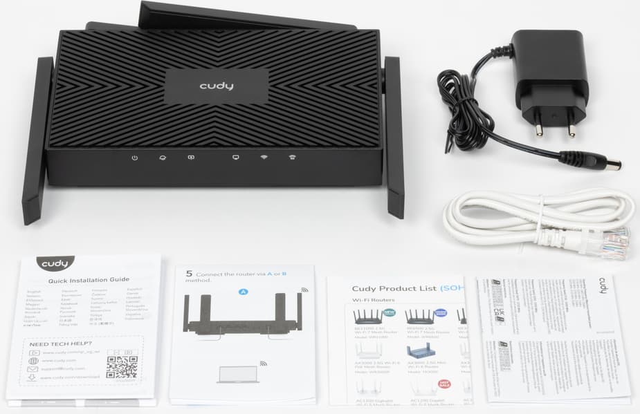 Комплект поставки стандартный — роутер, блок питания, патч-корд, листовки-описания. Блок питания компактный, имеет характеристики 12 В 1 А, оборудован кабелем 1,2 м со стандартным круглым штекером. Патч-корд неожиданно белого цвета, имеет категорию 5e и длину 1 м.