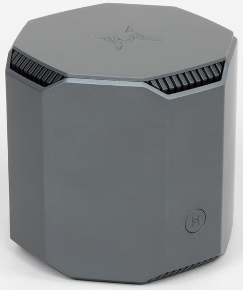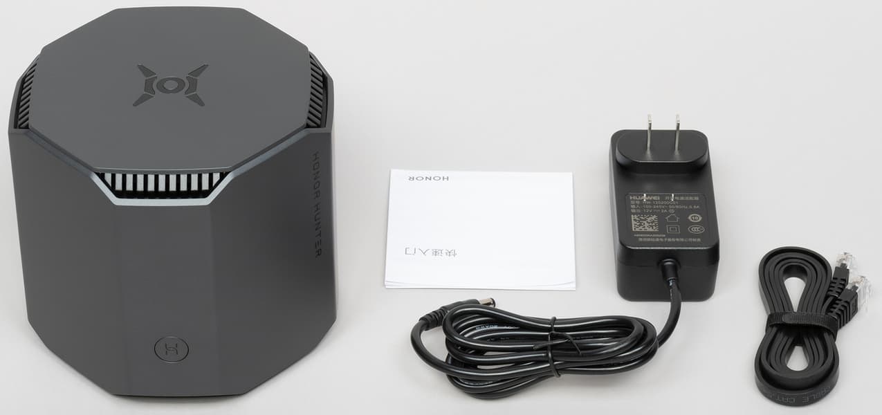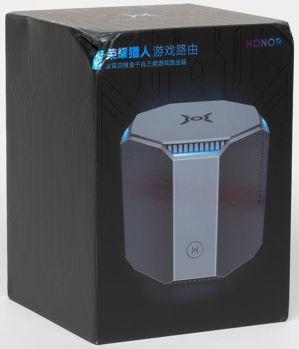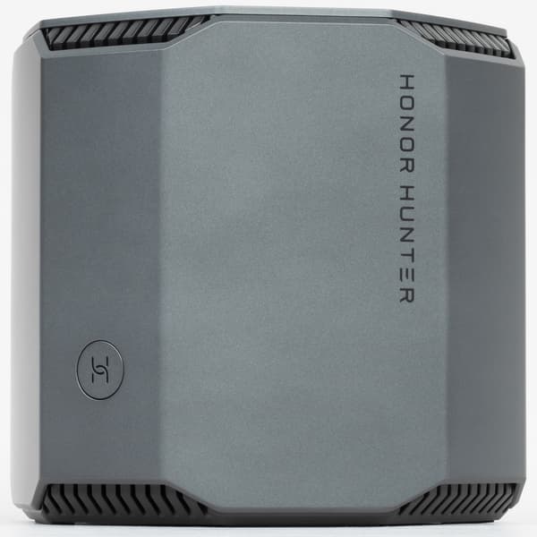 Корпус роутера выполнен в виде восьмиугольной призмы. Габаритные размеры составляют 135×135×125 мм. Материал корпуса — темно-серый матовый пластик. На одной из сторон — вертикальная надпись «Honor Hunter». Вариант установки один — на стол или полку. Устойчивости придают резиновые вставки-ножки на дне.