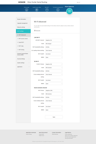 В сетевых настройках предусмотрены следующие возможности: изменение адреса LAN, настройка сервера DHCP (в том числе резервирование адресов для клиентов), настройка клиента VPN (поддерживаются соединения PPTP и L2TP), включение протокола UPnP и просмотр настроенных с его использованием правил трансляции портов, включение режима объединенной беспроводной сети (вероятно, вариант Mesh в исполнении Honor), включение протокола IPv6.