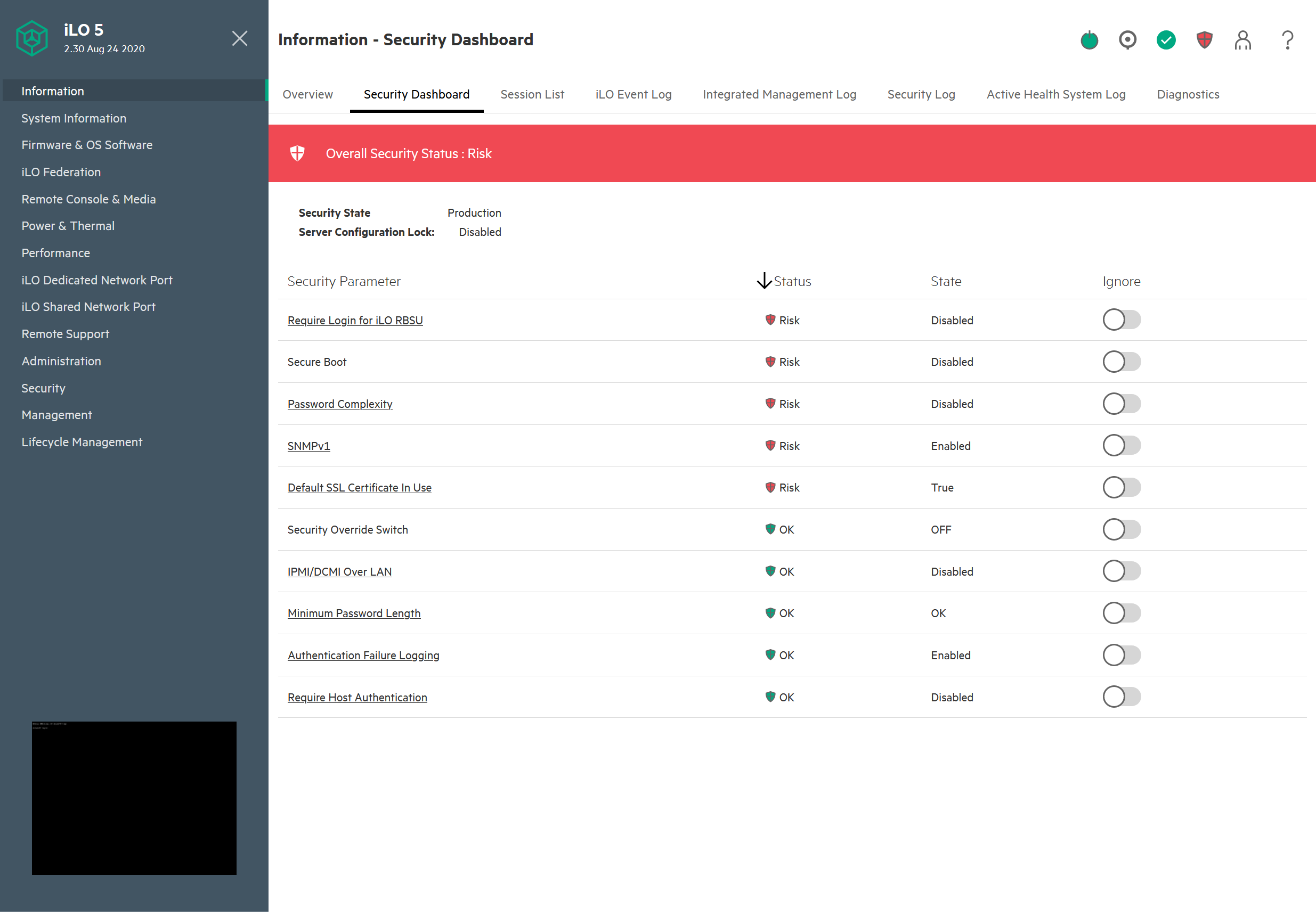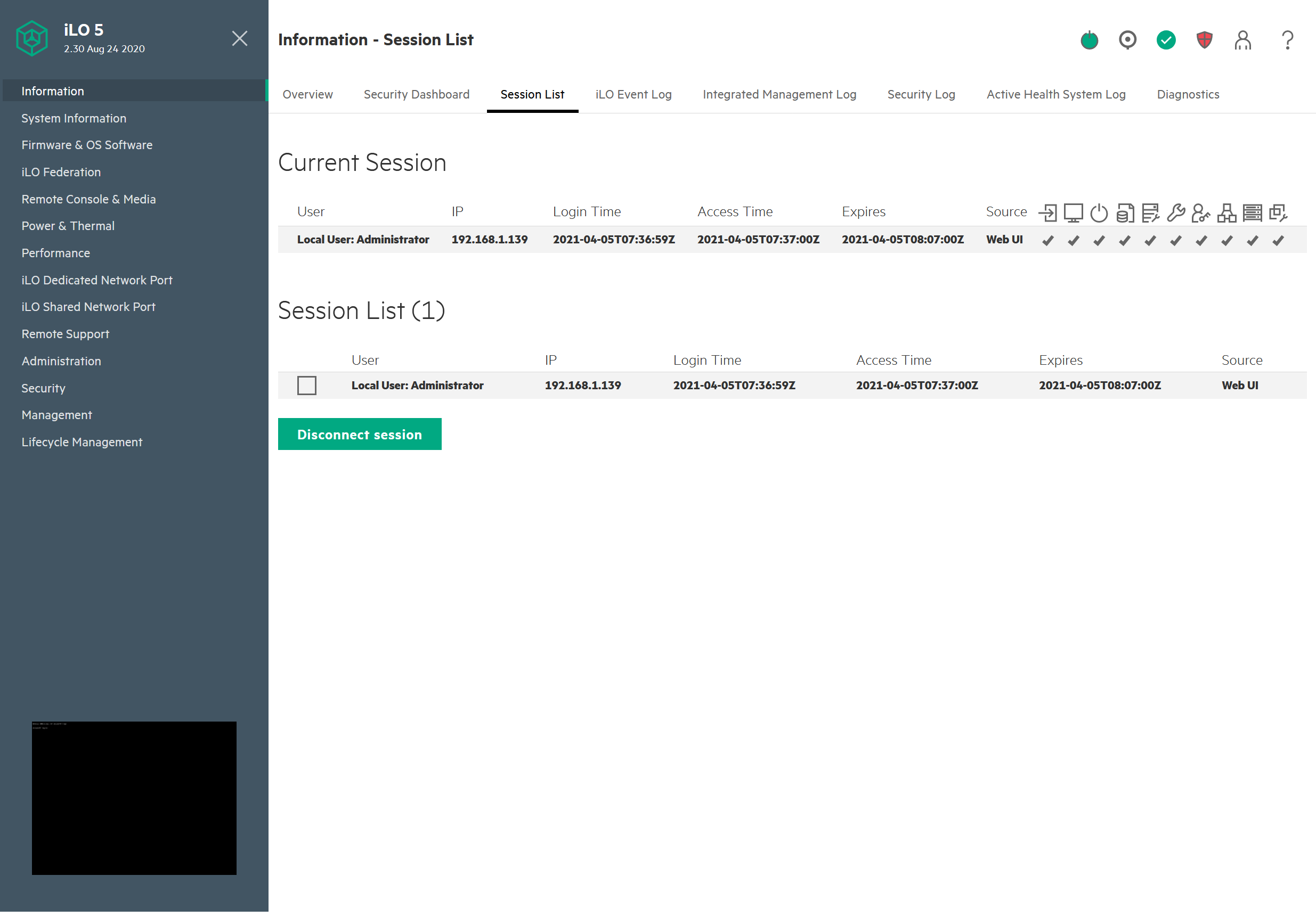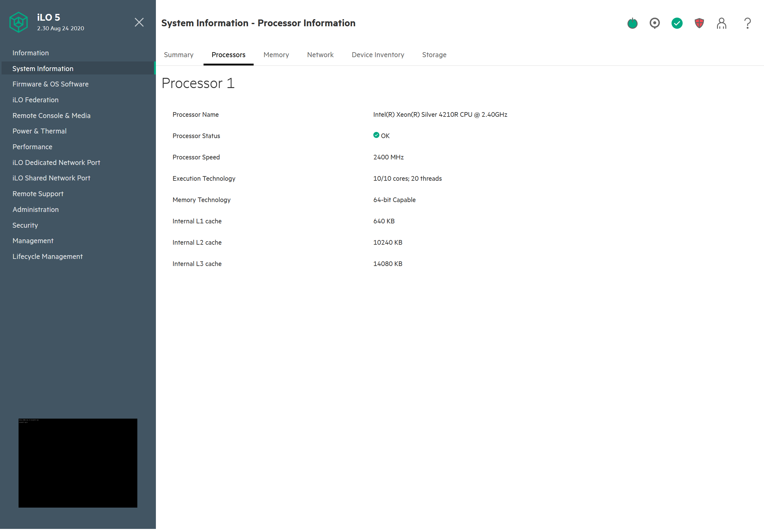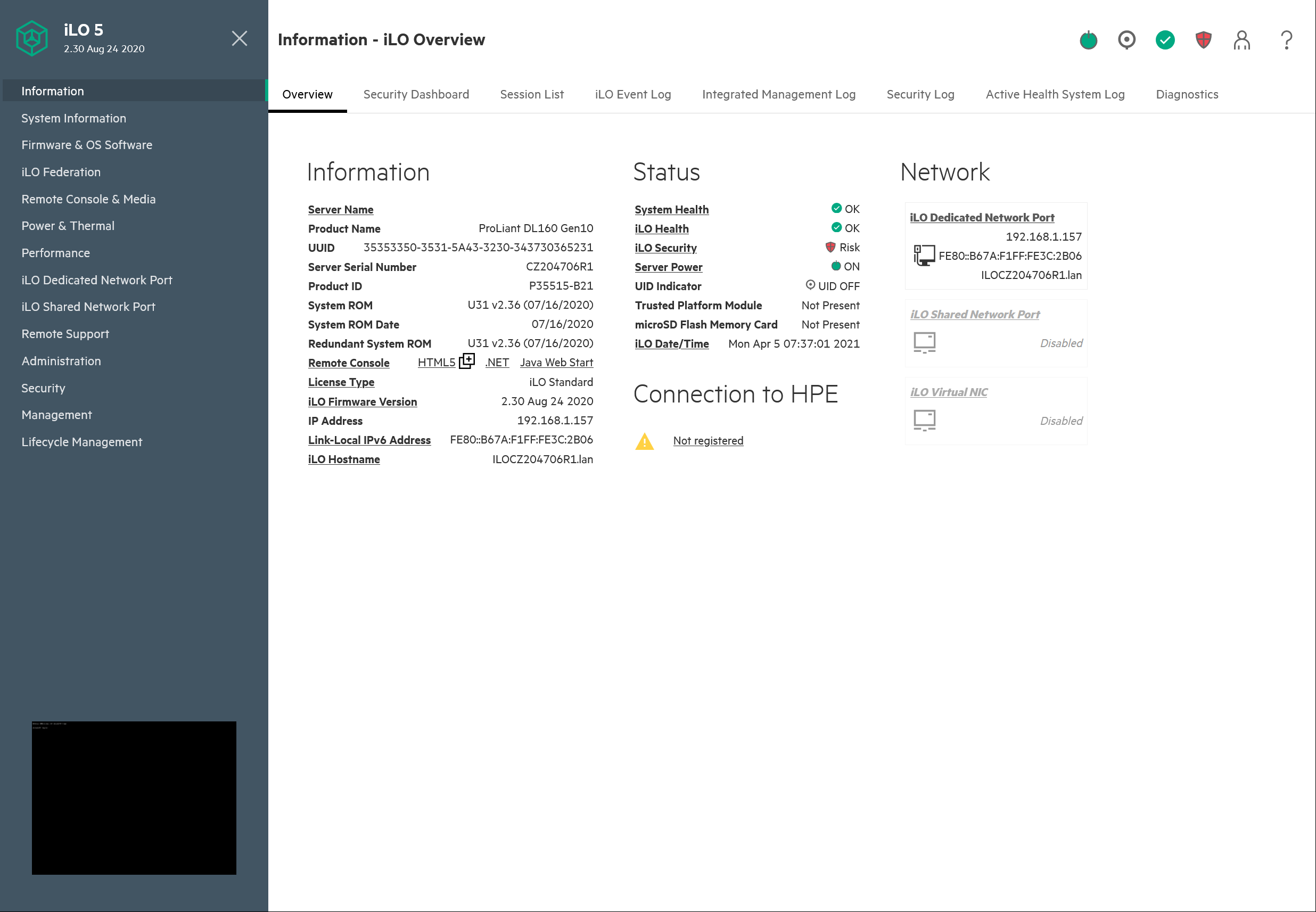 Как и большинство серверных платформ, рассматриваемая модель оборудована системой удаленного контроля. В данном случае речь идет про iLO 5. Перед дальнейшим описанием сервиса, отметим, что HPE предлагает несколько вариантов данной технологии, которые отличаются возможностями. В нашем случае в комплект входила базовая версия iLO Standard, которая штатно поставляется со всеми серверами. За дополнительную плату можно приобрести лицензию на iLO Advanced. Полный список функций составляет пять десятков строк, так что приводить их все здесь нет смысла. Интересующиеся могут обратиться к оригинальному документу на сайте производителя.