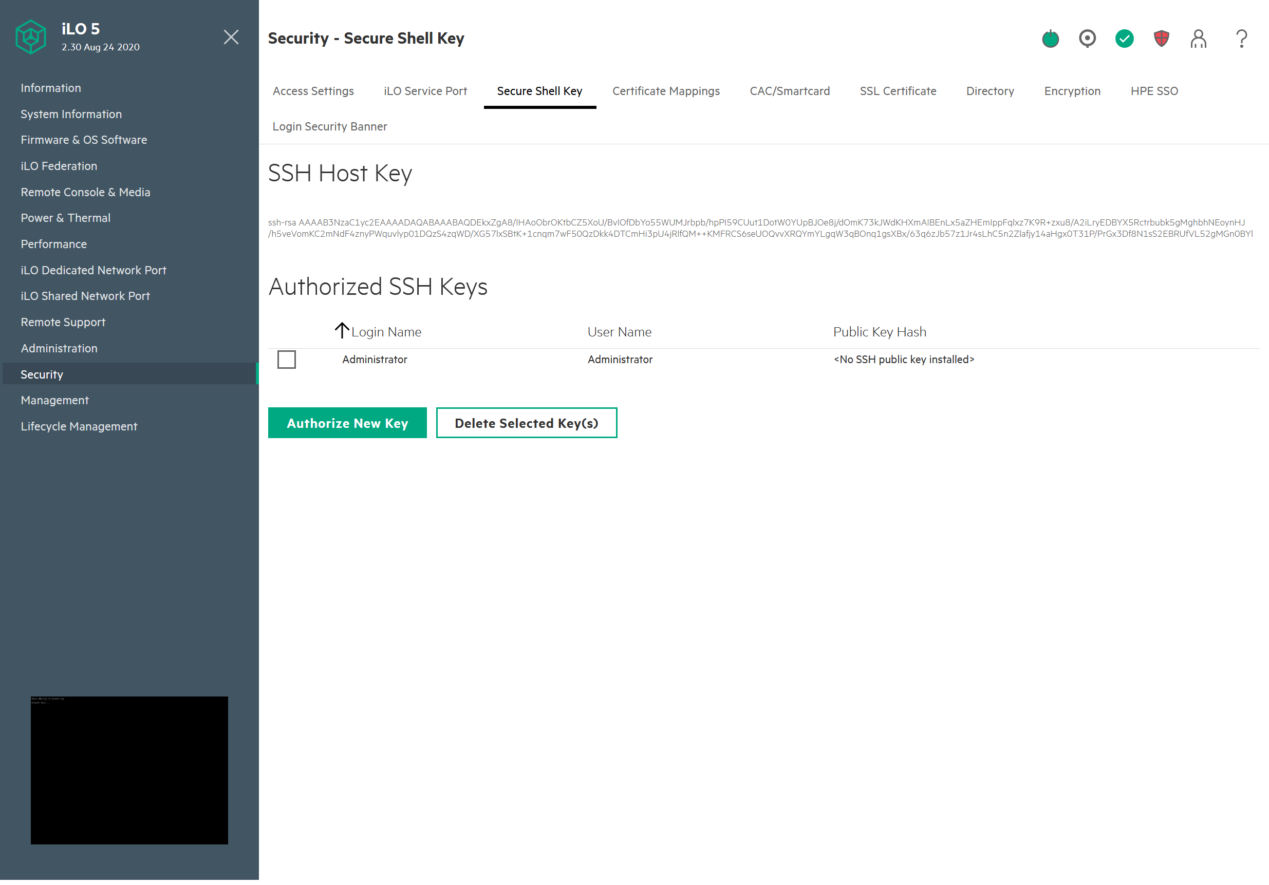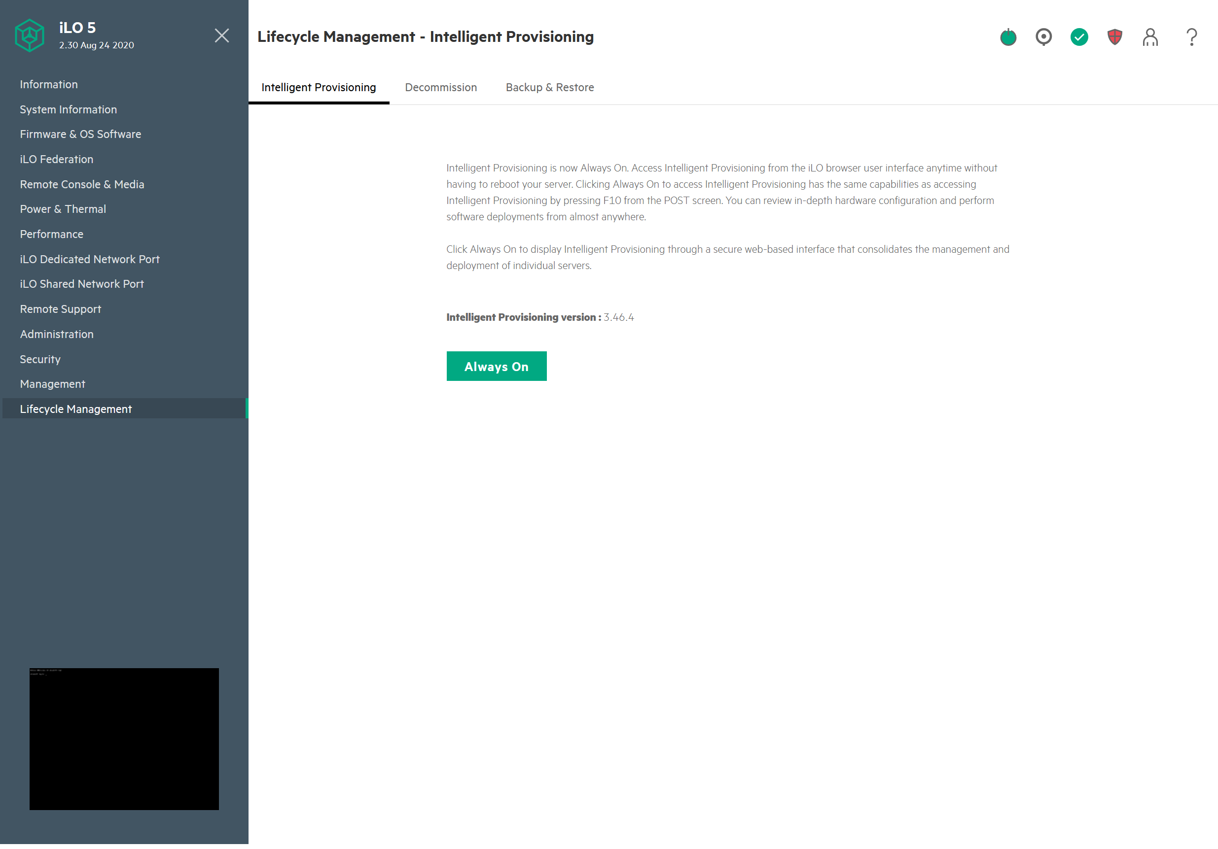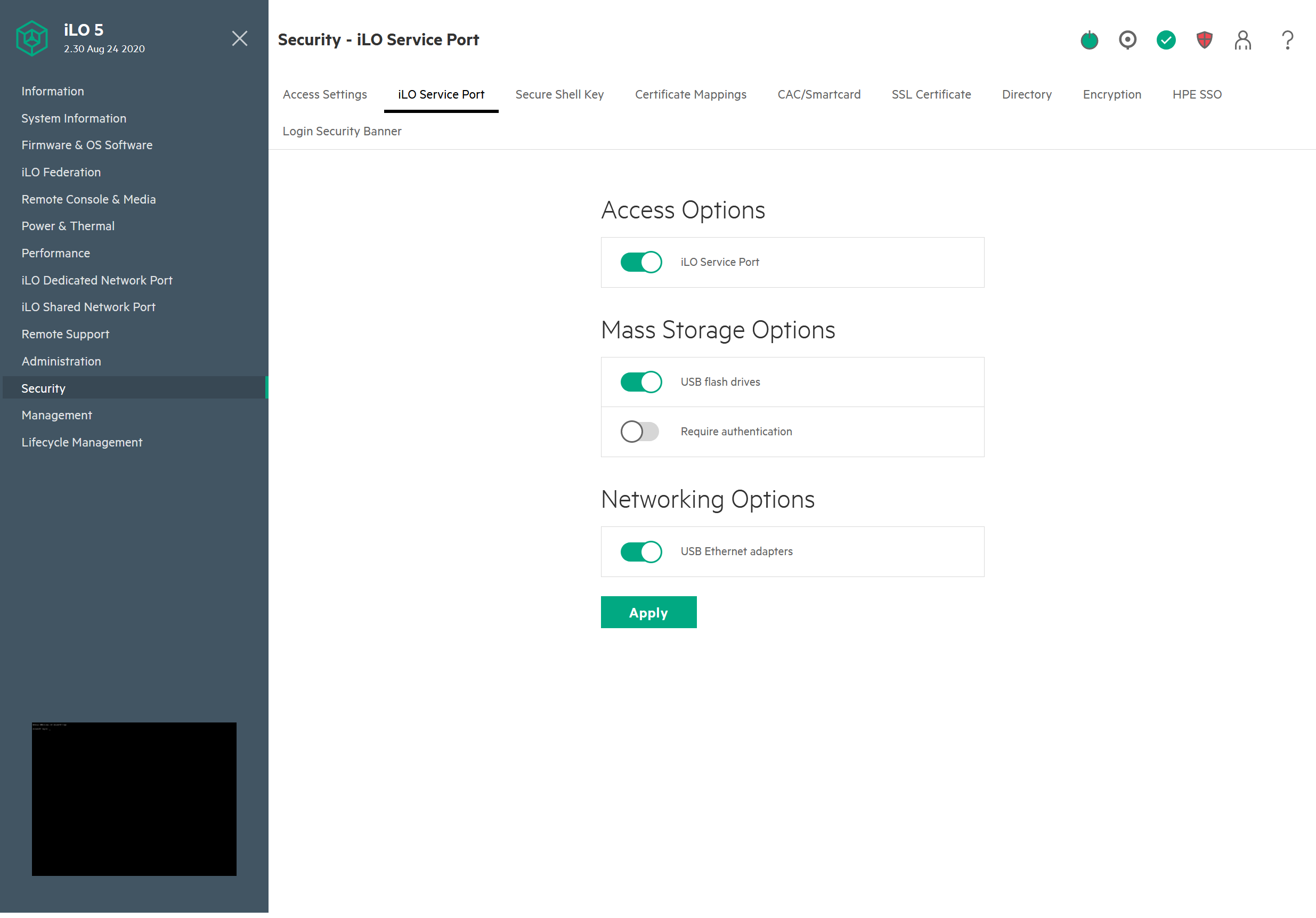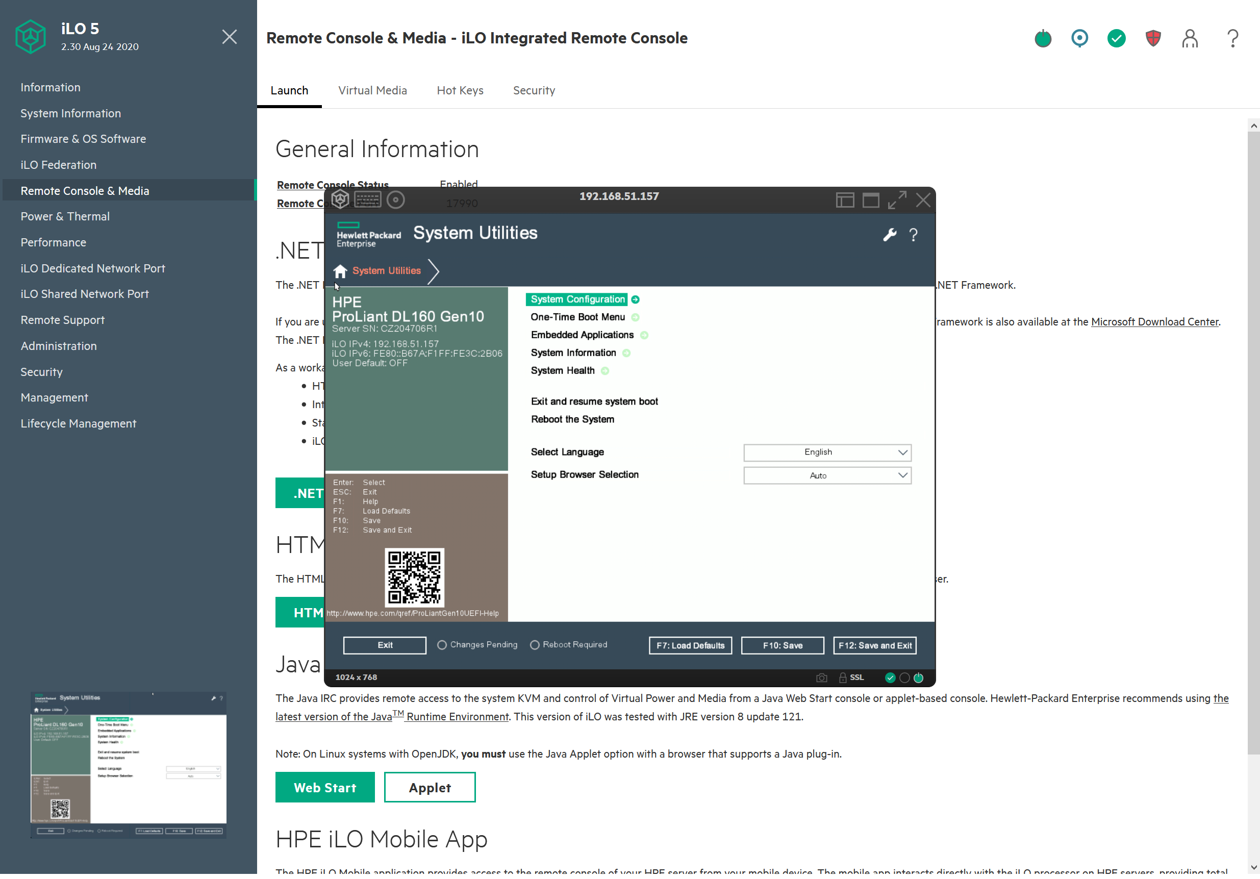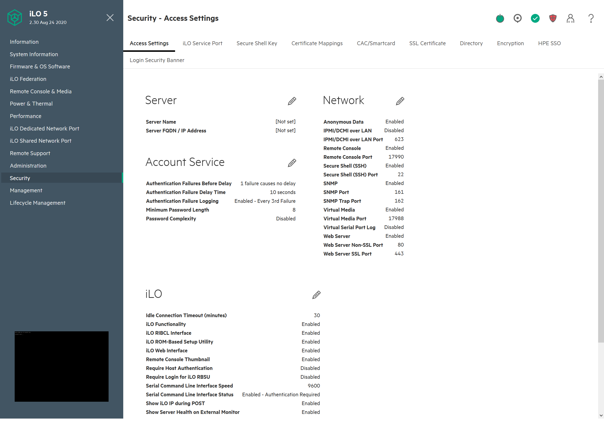 Как и большинство серверных платформ, рассматриваемая модель оборудована системой удаленного контроля. В данном случае речь идет про iLO 5. Перед дальнейшим описанием сервиса, отметим, что HPE предлагает несколько вариантов данной технологии, которые отличаются возможностями. В нашем случае в комплект входила базовая версия iLO Standard, которая штатно поставляется со всеми серверами. За дополнительную плату можно приобрести лицензию на iLO Advanced. Полный список функций составляет пять десятков строк, так что приводить их все здесь нет смысла. Интересующиеся могут обратиться к оригинальному документу на сайте производителя.