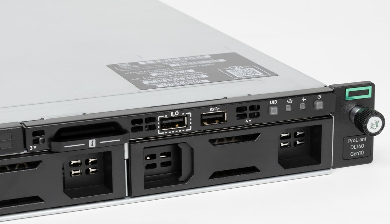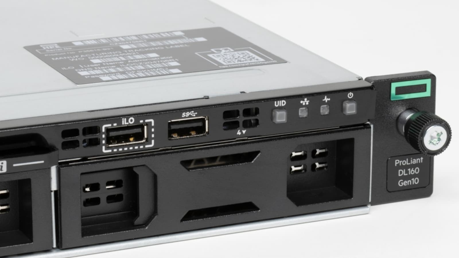 Портов на лицевой панели два — один подписан как служебный порт iLO, второй — просто USB 3.0 Type A. Далее идут кнопка и светодиод идентификации сервера, светодиод активности встроенной сетевой карты, индикатор общего состояния сервера, кнопка включения питания со встроенным индикатором. Отметим, что порта для монитора здесь нет.