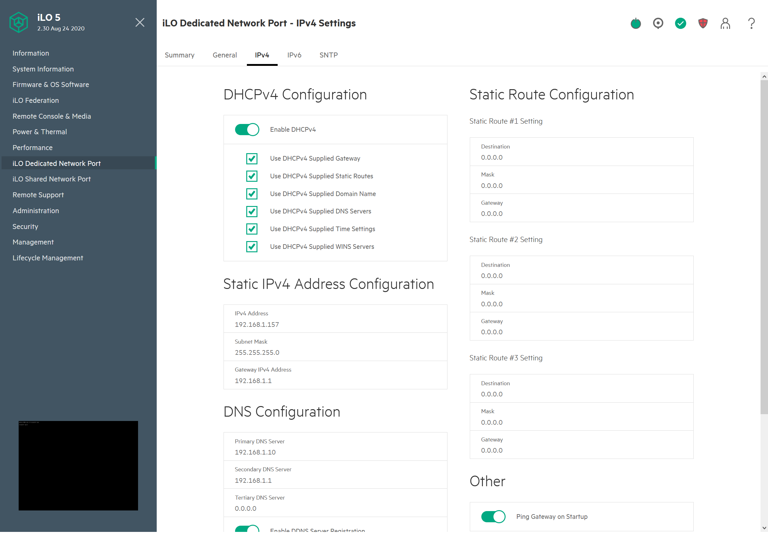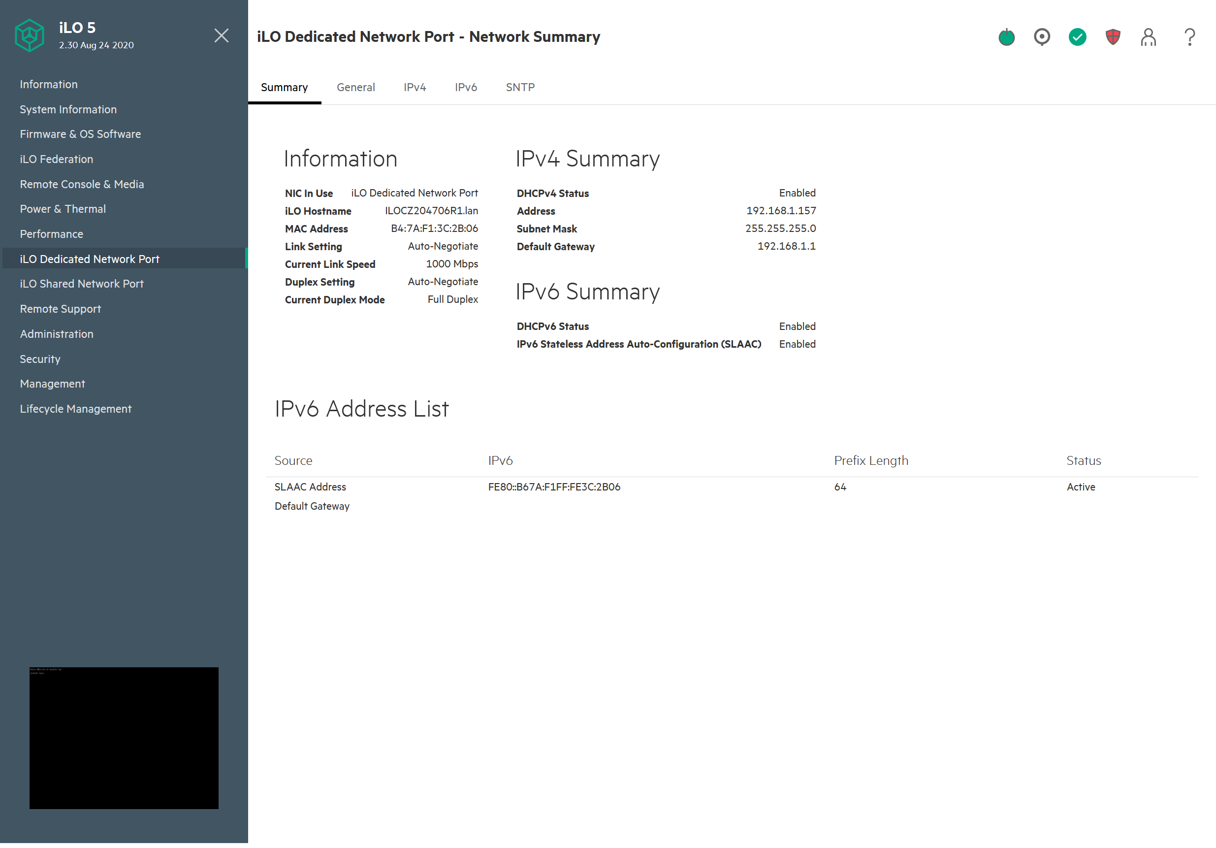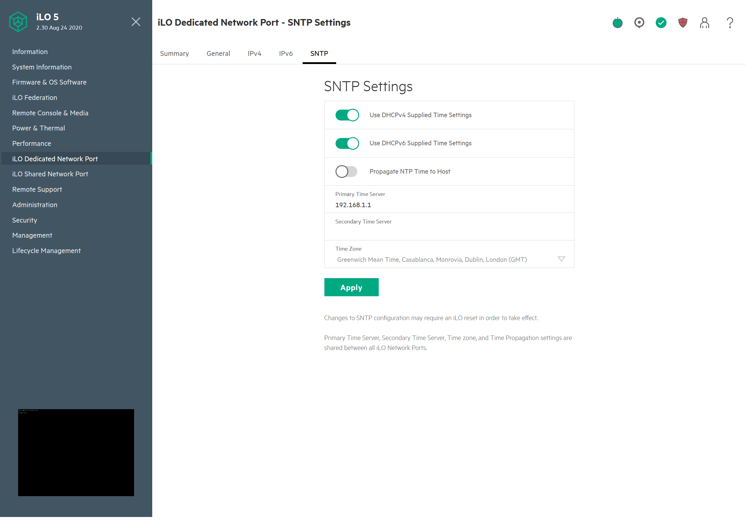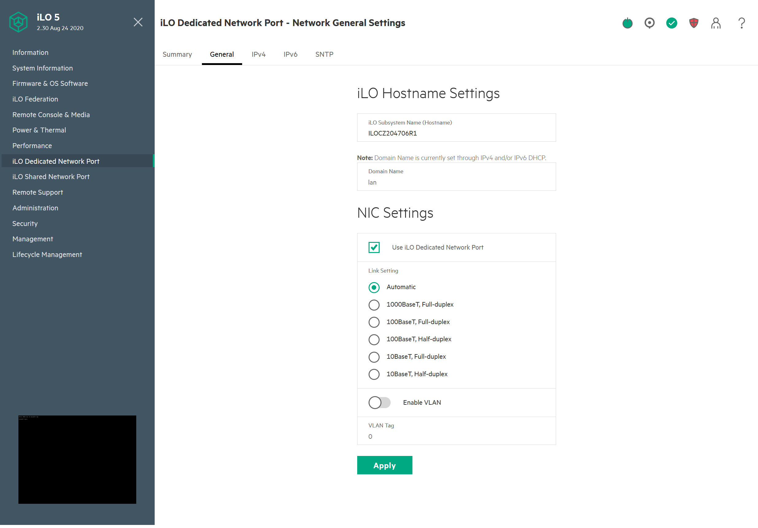 Далее идут настройки сетевого порта iLO. Он может быть как физически выделенным, так и совмещенным с одним из встроенных сетевых адаптеров. Кроме выбора скорости, сетевых адресов (как IPv4, так и IPv6), можно настроить VLAN, сетевое имя данного сервиса и сервис синхронизации встроенных часов.