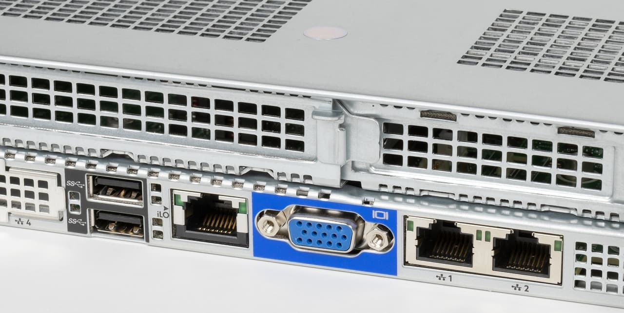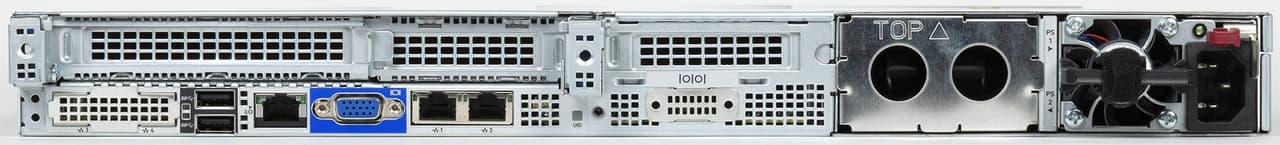 Сзади расположены слоты для карт расширения, два порта USB 3.0 Type A, сетевой порт iLO, выход VGA на монитор, два гигабитных сетевых порта со встроенными индикаторами, светодиод идентификации сервера, отсек для блоков питания. Плюс есть места для опциональных последовательного порта и фирменной платы ввода-вывода.