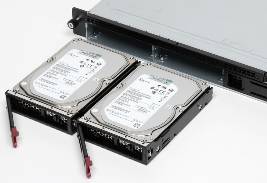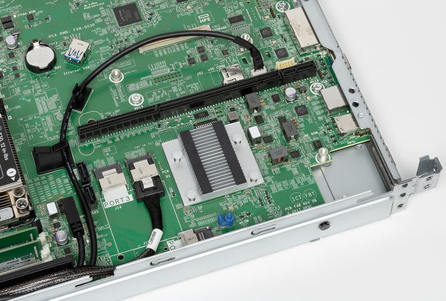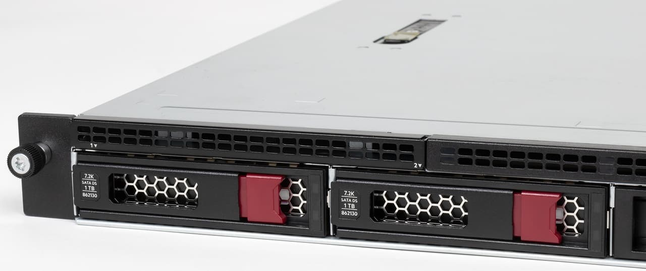 Что касается установленных жестких дисков, то последние представляют собой пару брендированных версий Seagate Exos 7E8 объемом 1 ТБ с интерфейсом SATA и скоростью вращения 7200 RPM (ST1000NM000A). В варианте HPE они называются MB001000GWWQE и имеют адаптированную специальную прошивку. Напомним, что всего здесь есть четыре отсека LFF, что также является одним из стандартных вариантов для формата серверов 1U. Альтернативный вариант конфигурации — восемь отсеков формата SFF для накопителей 2,5″ — может быть интересен в случае обеспечения высокой скорости подсистемы хранения данных. Конечно, поддерживается горячая замена дисков в корзинах. Заявленный максимальный объем системы хранения — 48 ТБ (четыре жестких диска по 12 ТБ). Модификации данной модели сервера для поддержки накопителей U.2 не предусмотрено. Можно использовать только диски с интерфейсами SATA и SAS (при наличии соответствующего адаптера).