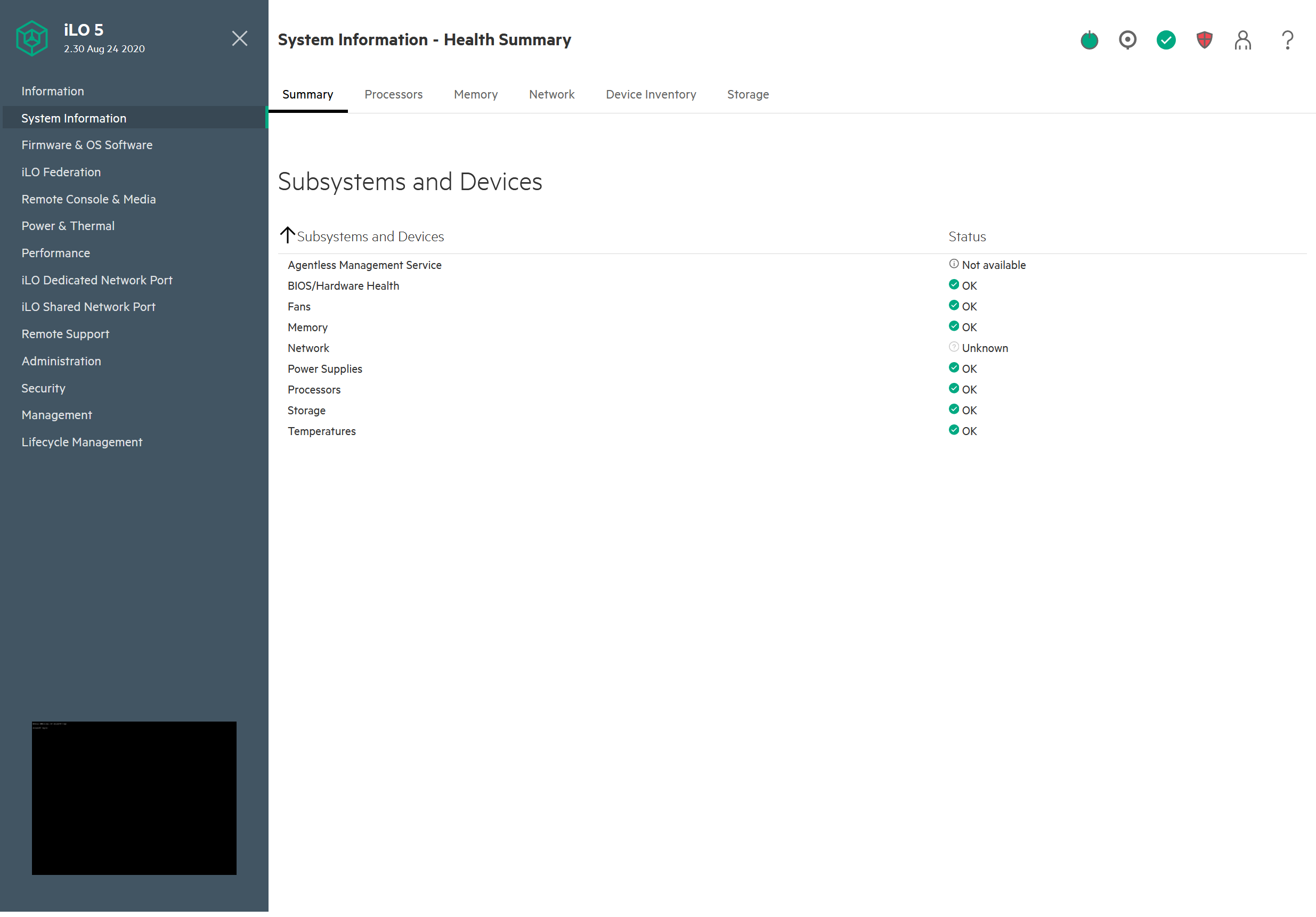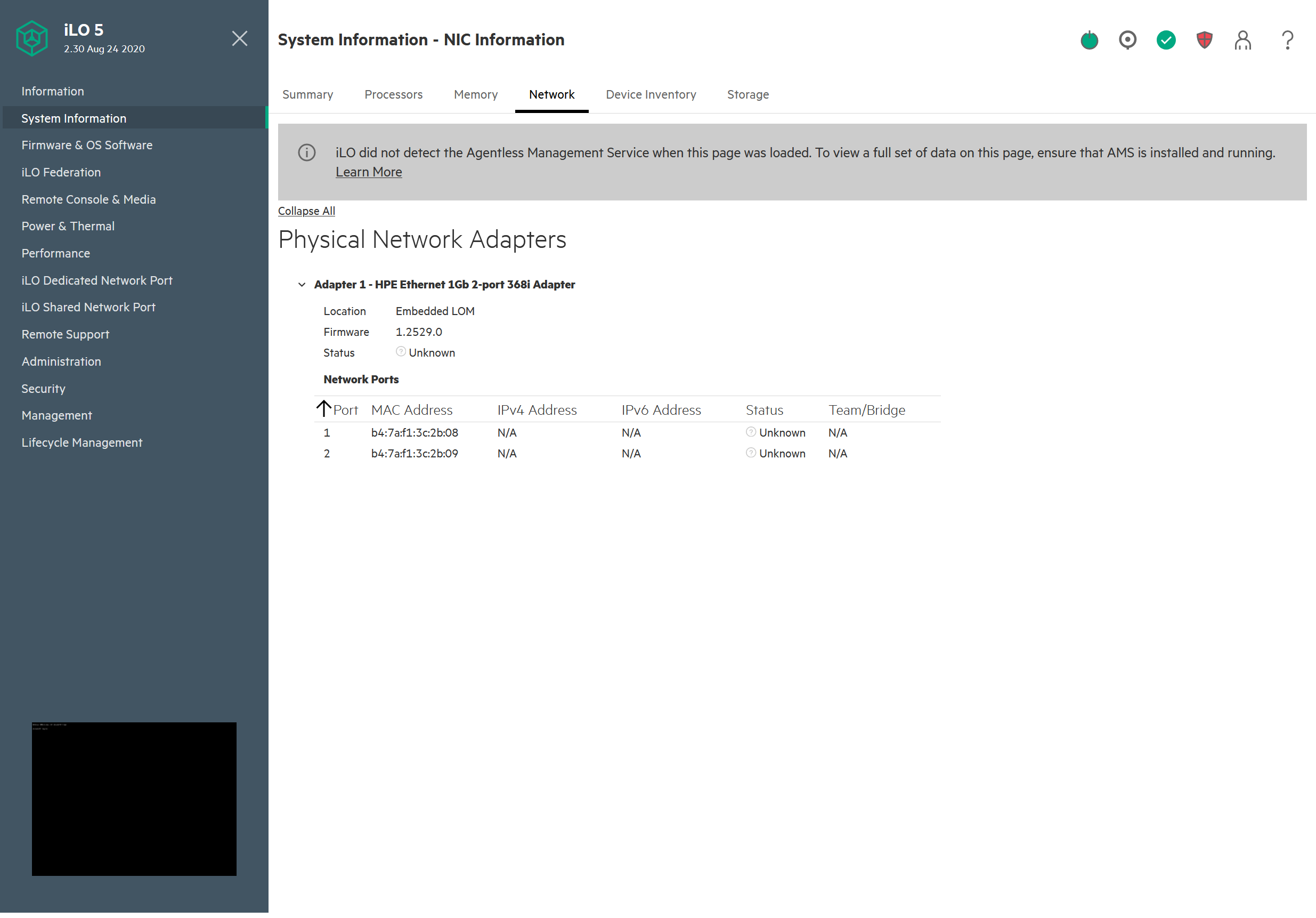 System Information позволяет проверить аппаратную конфигурацию сервера. Здесь можно посмотреть модель процессора (процессоров), модули оперативной памяти, сетевые карты и их MAC-адреса, установленные платы расширения, дисковый контроллер и накопители (при использовании режима HPE Smart Array S100i). При этом некоторые данные (например, SMART жестких дисков и состояние сетевых подключений) требуют установки в операционной системе Agentless Management Service.