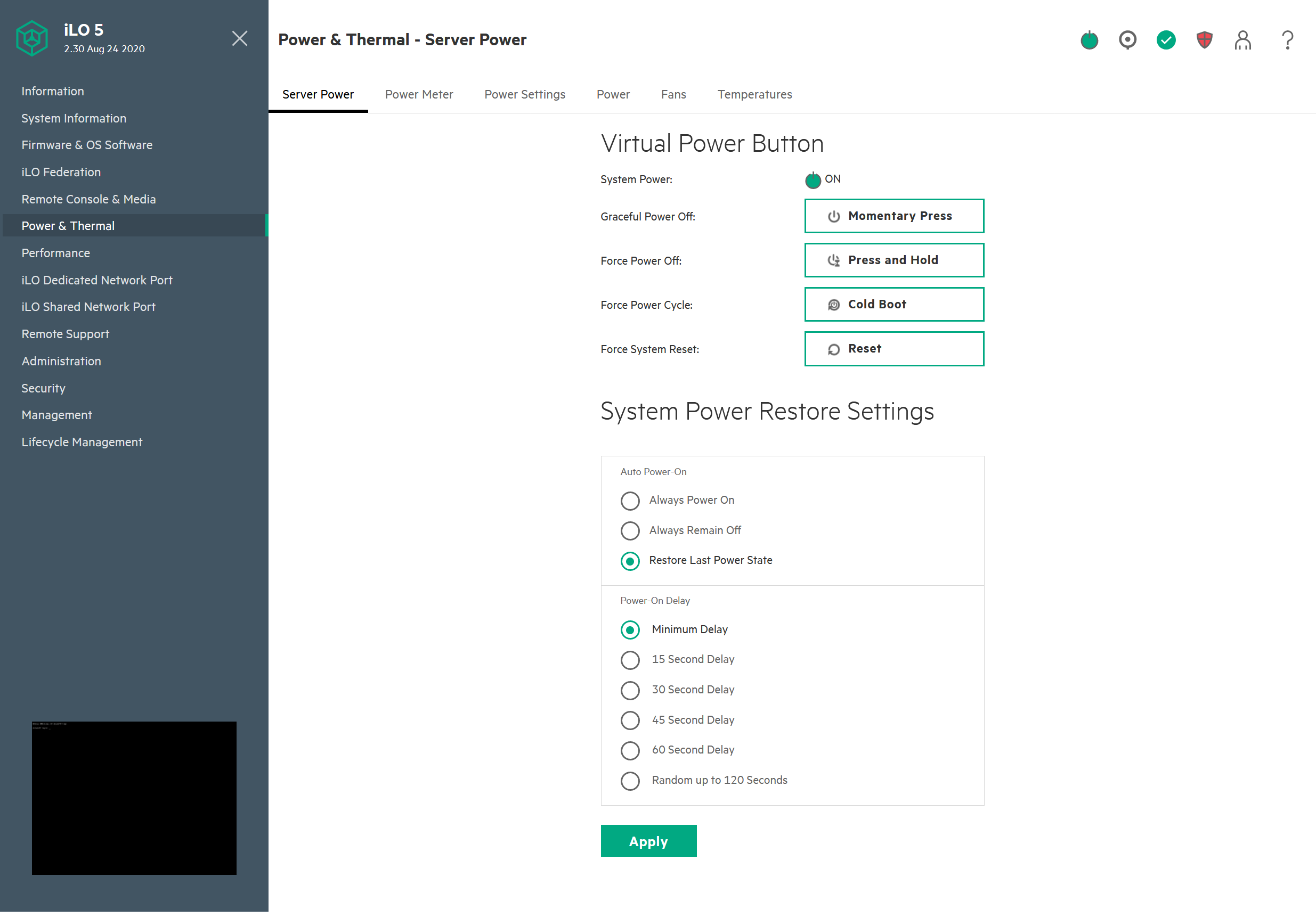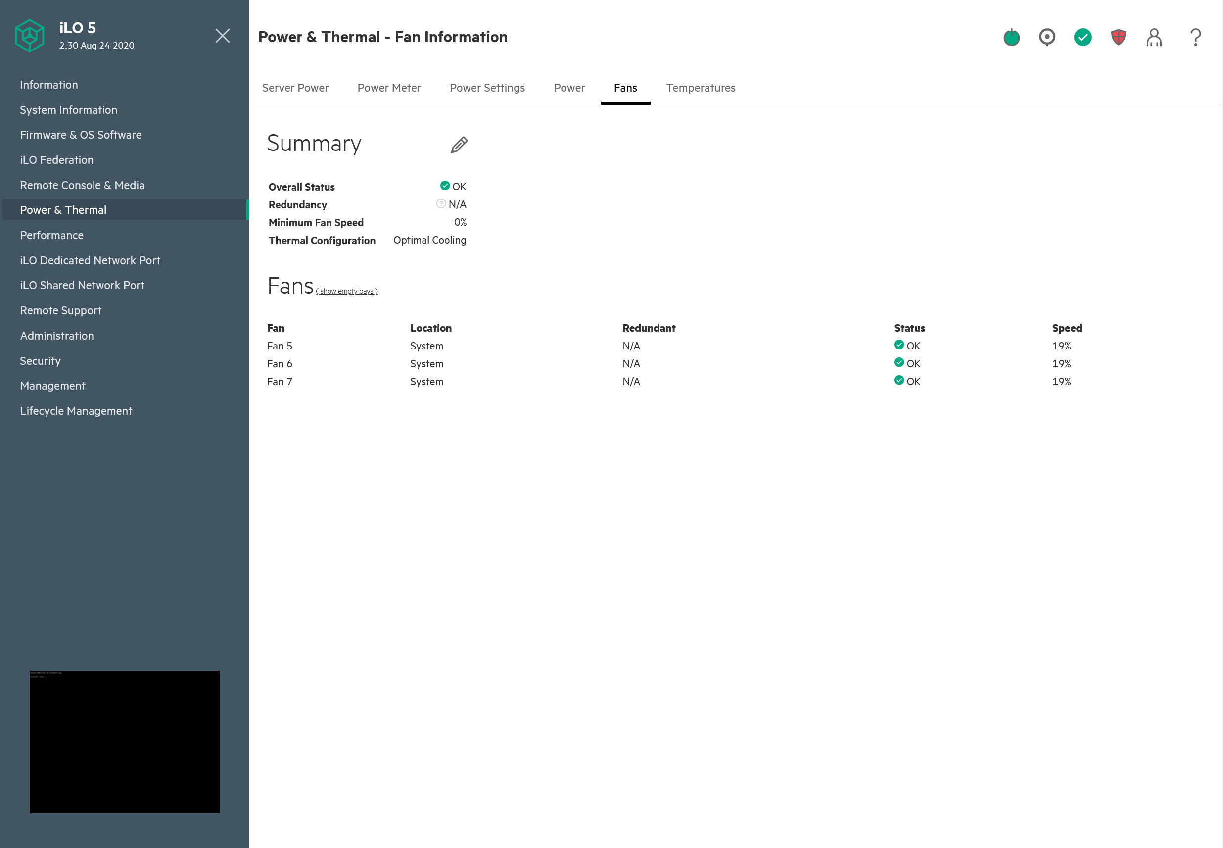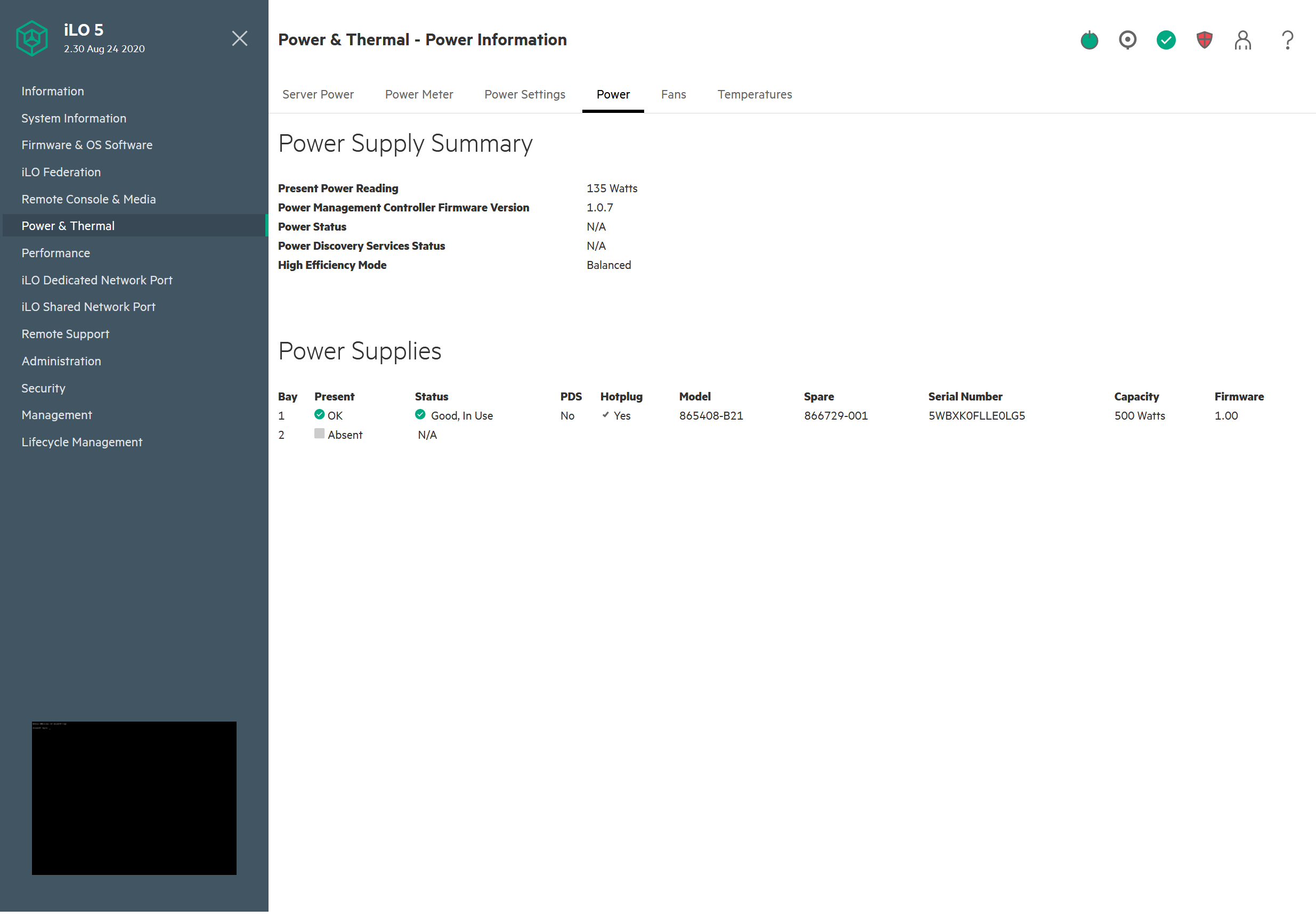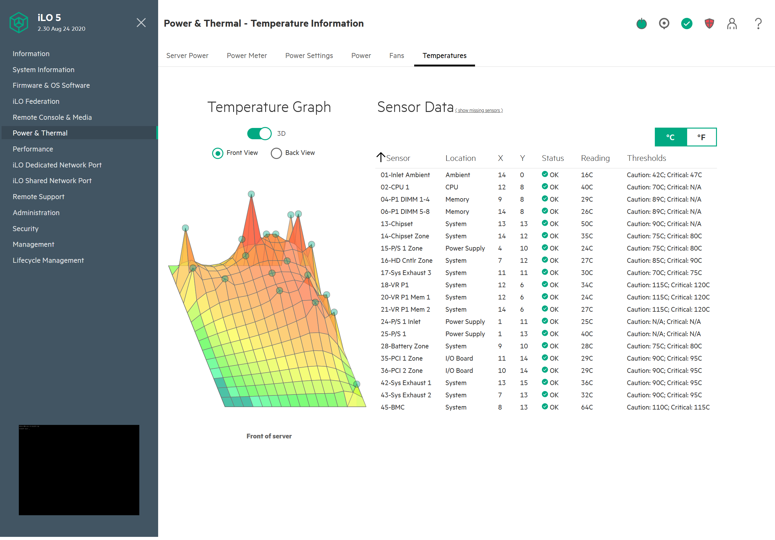Удаленное управление питанием является одной из базовых функций iLO. Кроме обычных операций по включению, выключению и перезагрузке, в группе Power & Thermal рассматриваемого сервера также предусмотрен выбор режима работы (можно отдать эту настройку и на усмотрение операционной системы), контроль реального потребления (для сбора статистики требуется лицензирование расширенного пакета iLO), контроль скоростей работы вентиляторов и температур. Датчиков последних (включая процессорные) в сервере есть более двух десятков, так что на отдельной странице можно посмотреть распределение температур в корпусе сервера в наглядном трехмерном виде.