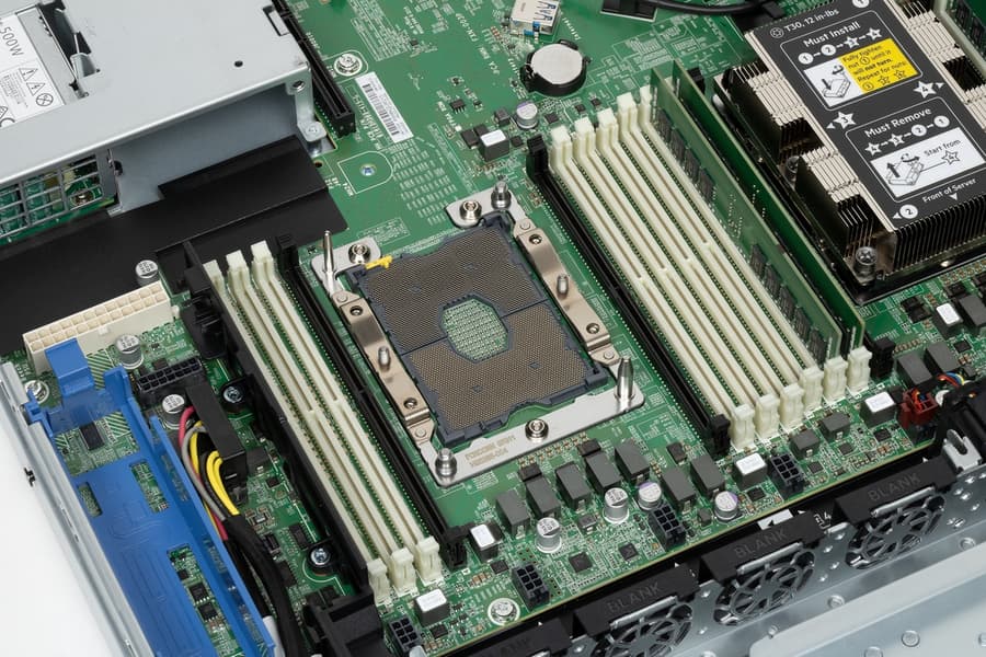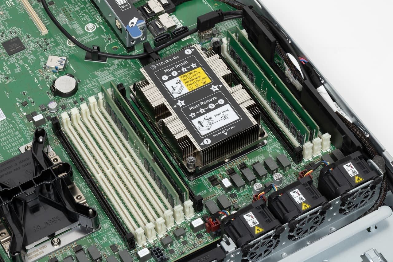 Наиболее распространенный вариант — увеличение объема оперативной памяти. Всего предусмотрено по 8 слотов на каждый процессорный сокет. С установкой никаких особенностей нет. Выключаем питание, отключаем кабели, выдвигаем сервер из стойки или демонтируем. Снимаем верхнюю крышку и сразу видим слоты для оперативной памяти.