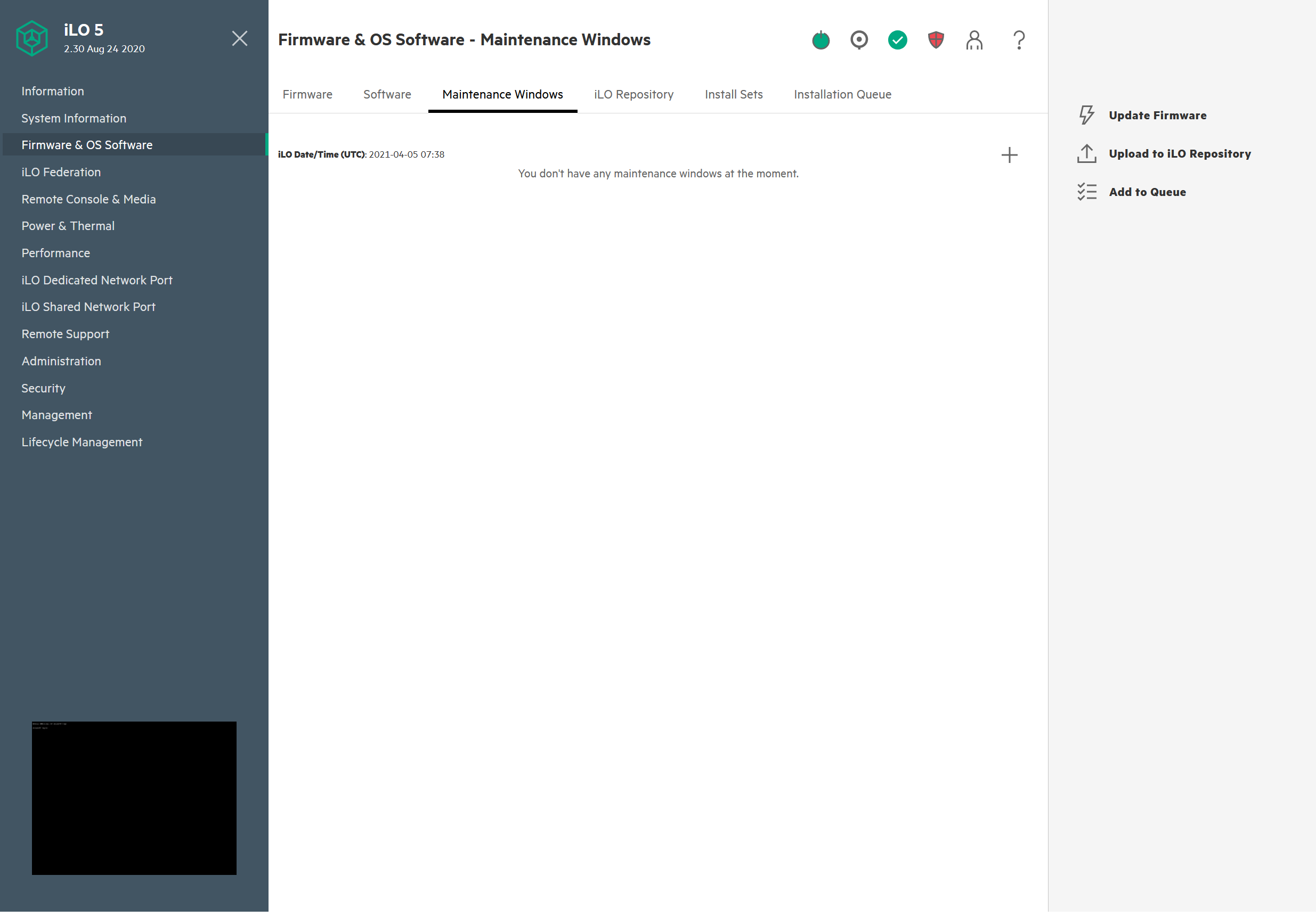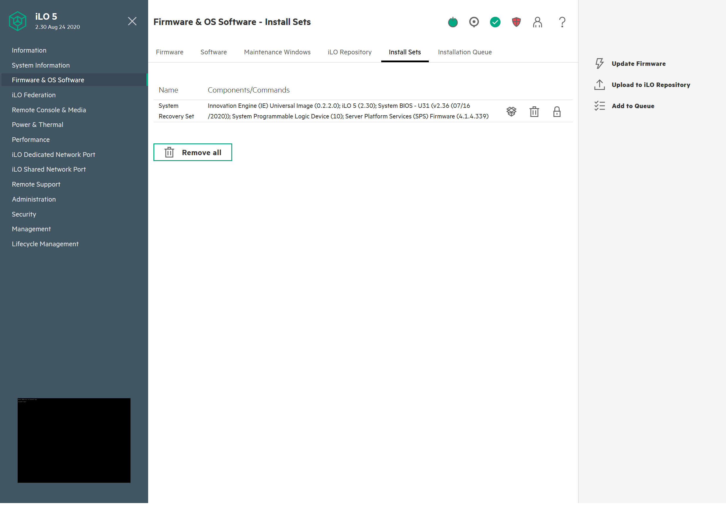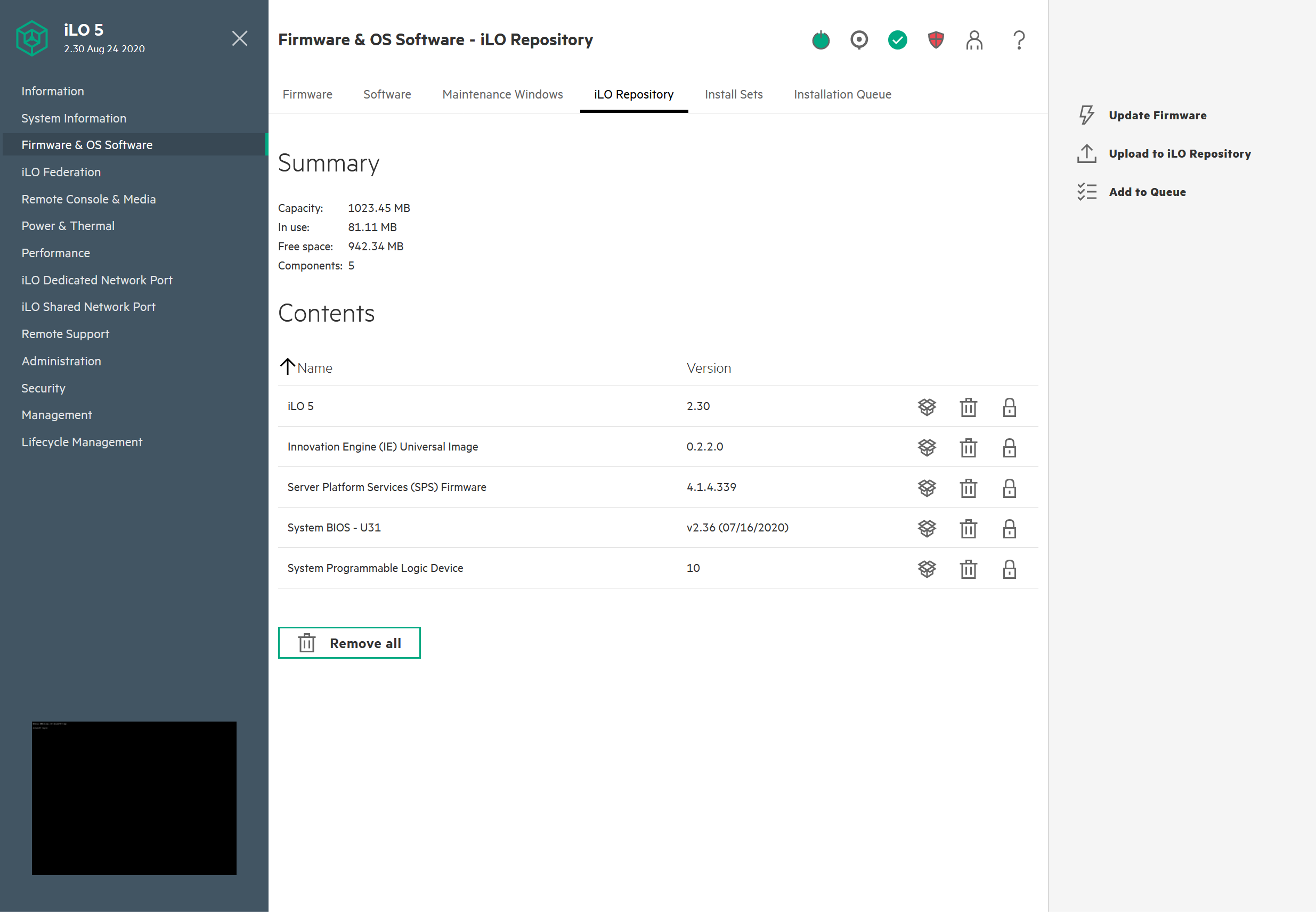 В разделе Firmware & OS Software указаны версии прошивок различных компонентов сервера, включая основной BIOS и сам iLO. Здесь же можно их обновить как независимо, так и общим пакетом.